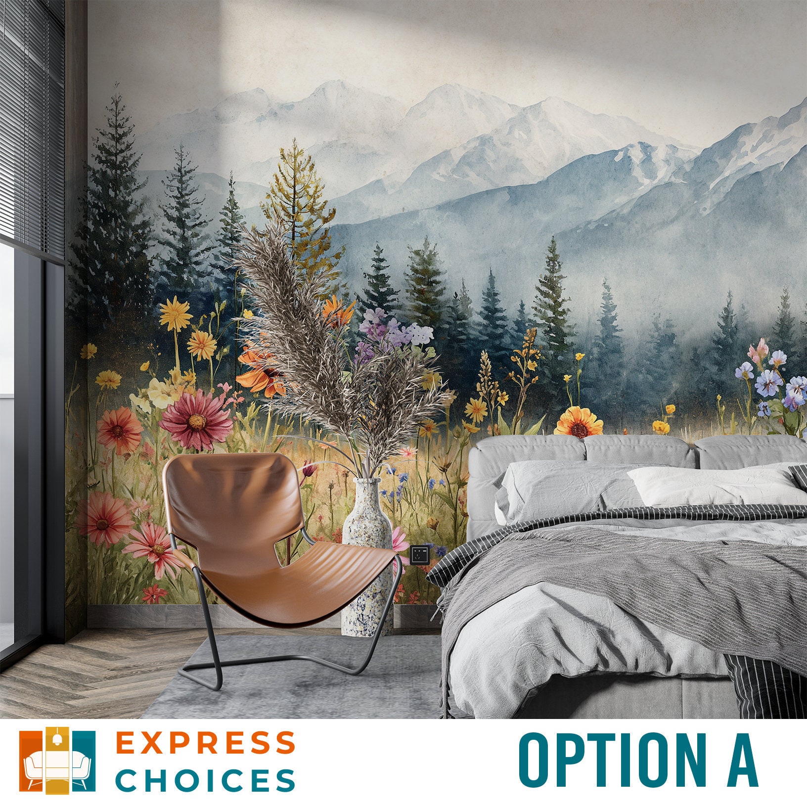 Mountain and Trees, Flowers Peel and Stick Wallpaper, Nursery Self ...