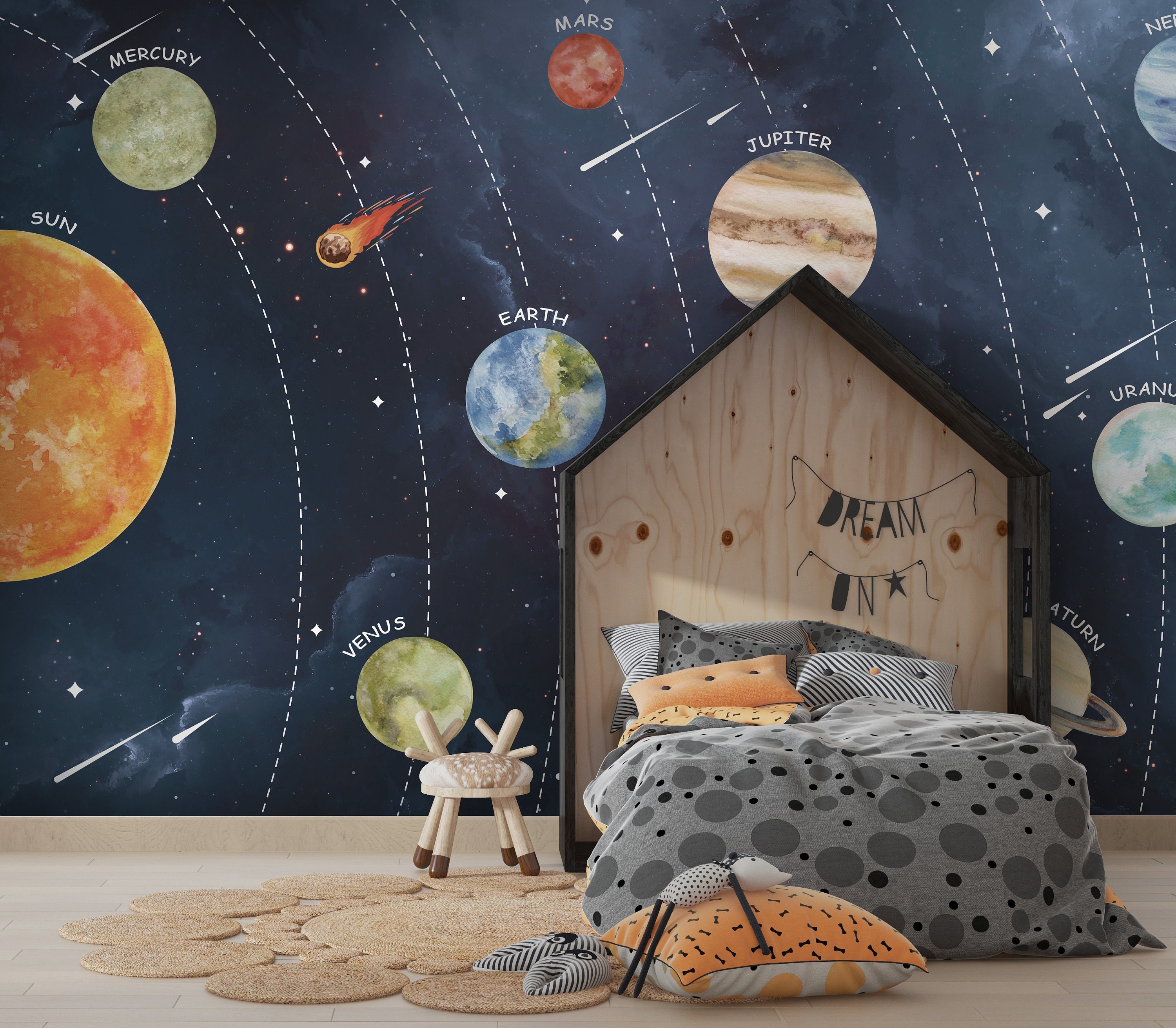 Kids Space Wall Mural | Watercolor Planet Wallpaper, Peel and Stick...
