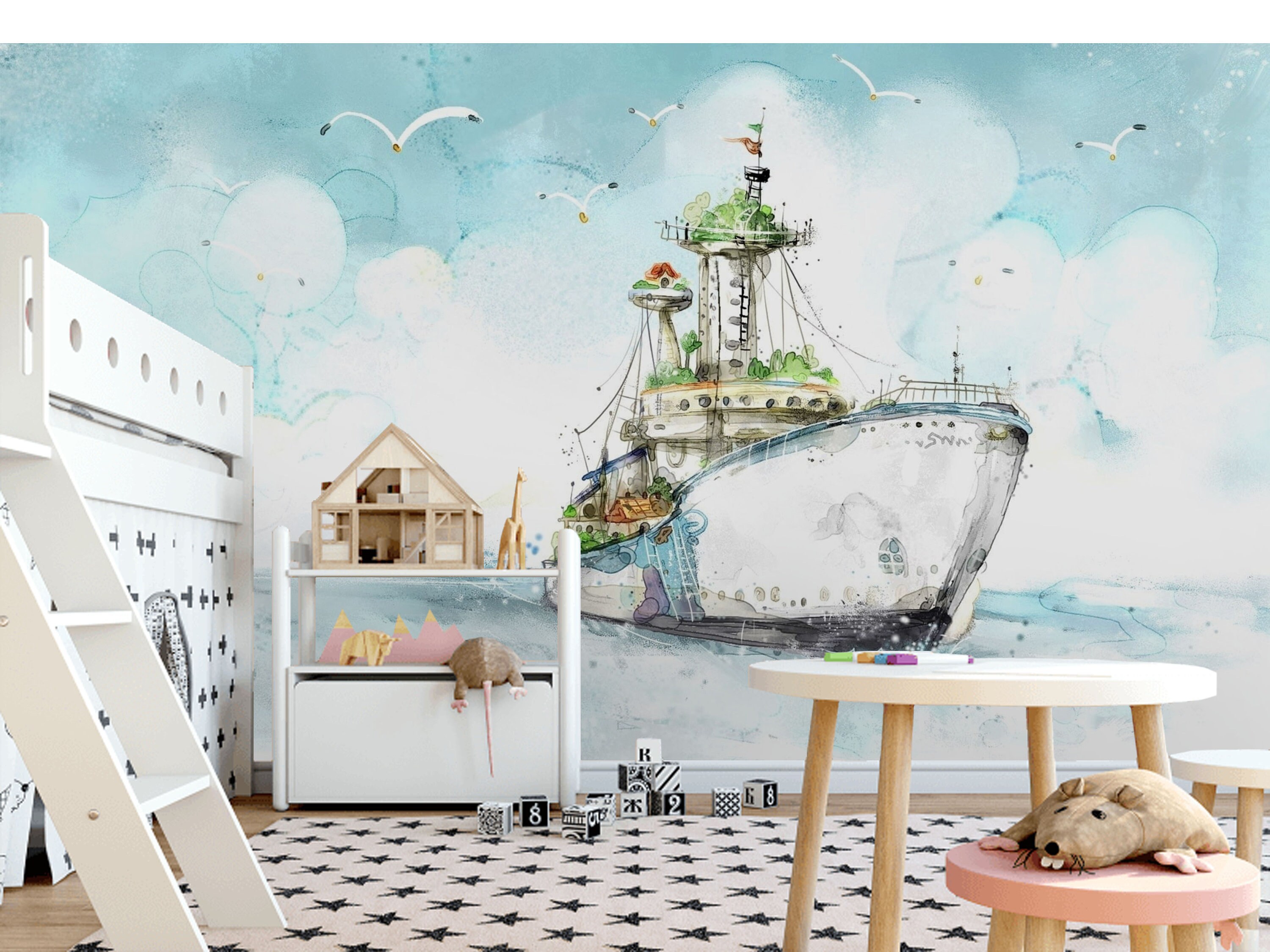 Watercolor ship nursery wallpaper Watercolor seascape removable wallpaper Self-adhesive Large Wallpa...