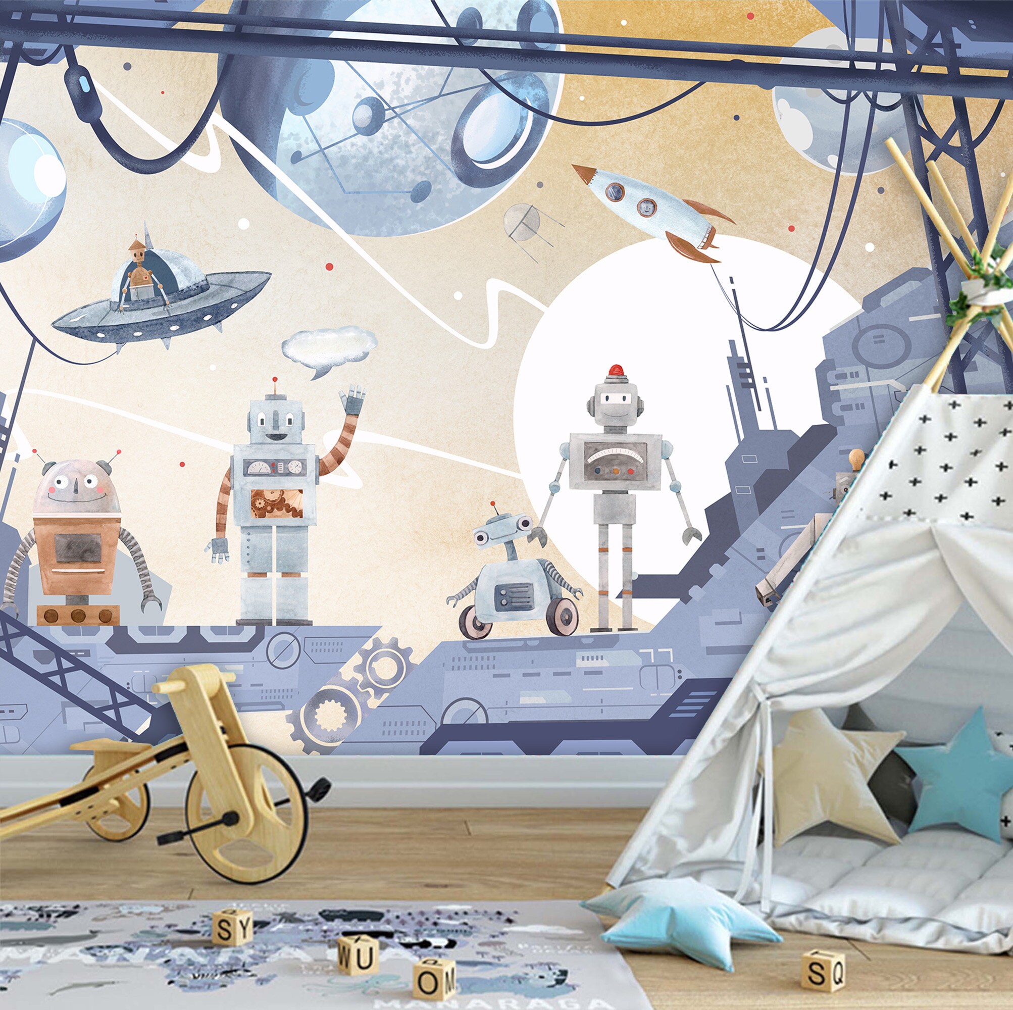 Robots & Planets Kids Wallpaper: Watercolor Nursery Wall Mural ...