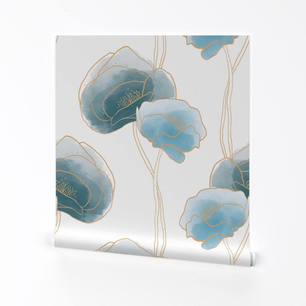 Elegant Poppy Gold or Silver Metallic Wallpaper - Blue Watercolor 1...