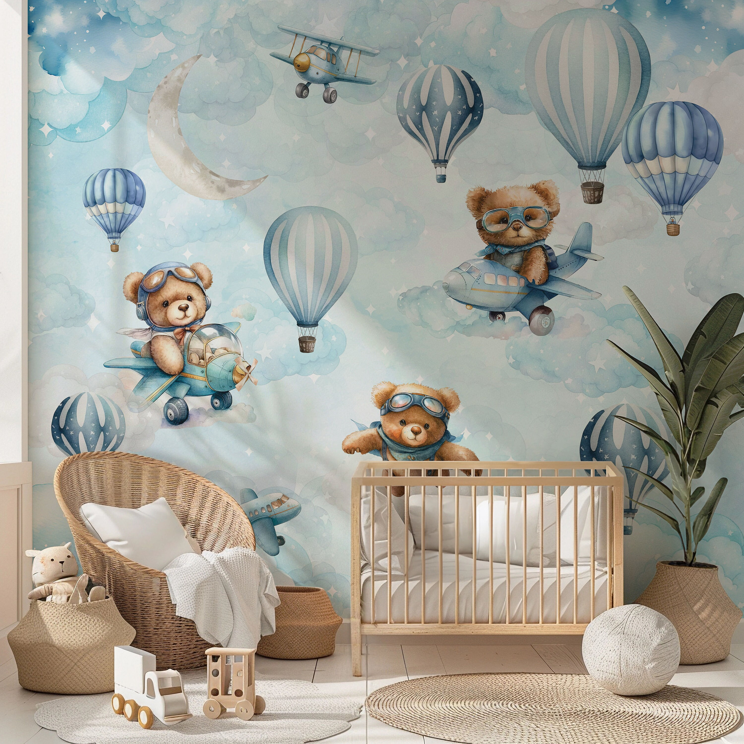 Blue Hot Air Balloon Nursery Wallpaper Flying Teddy Bear Aviator Wa...