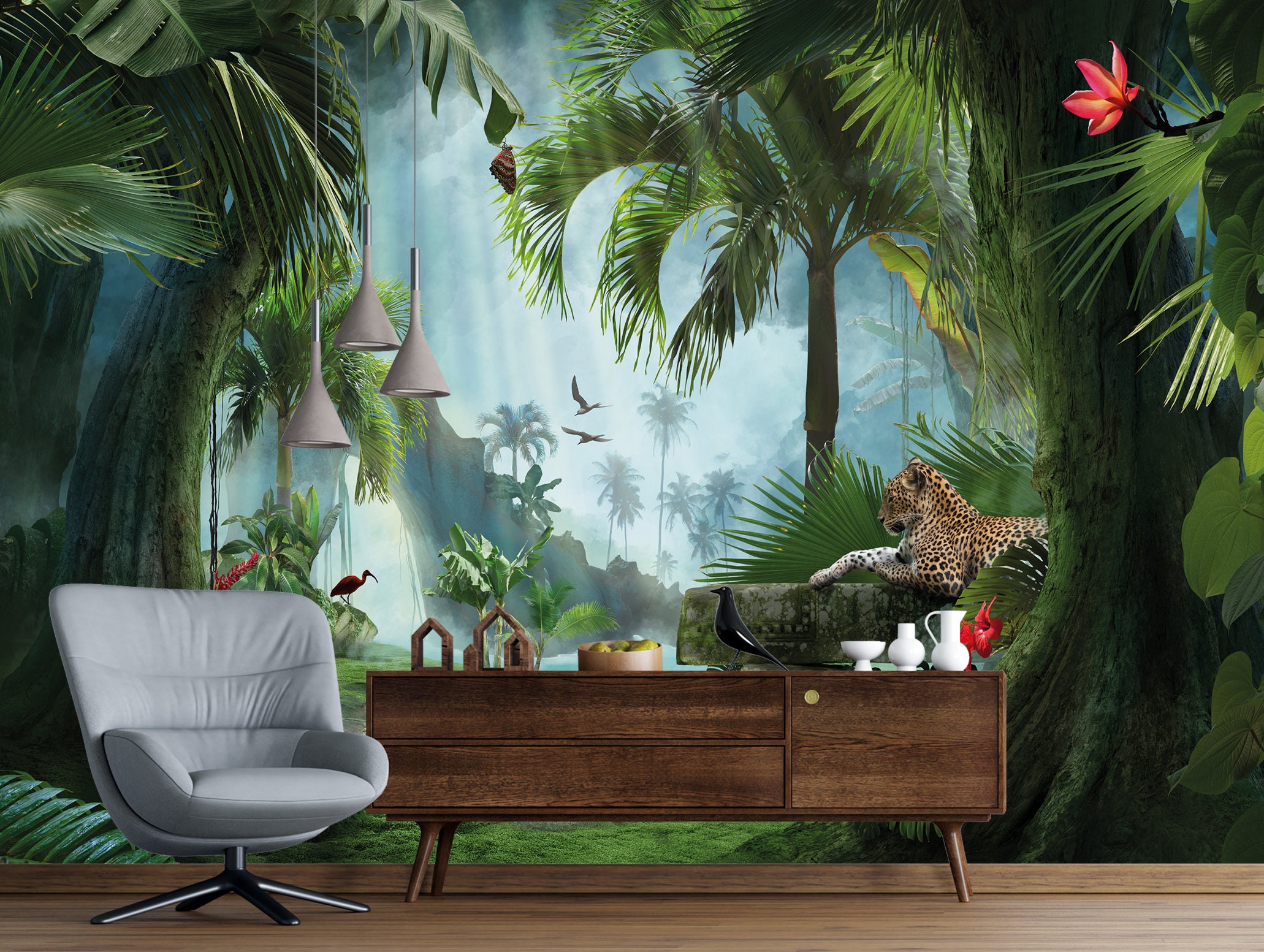 Landscape wallpaper.Forest nature mural.Modern tropical wallpaper mural.Removeable wallpaper.Wildlif...