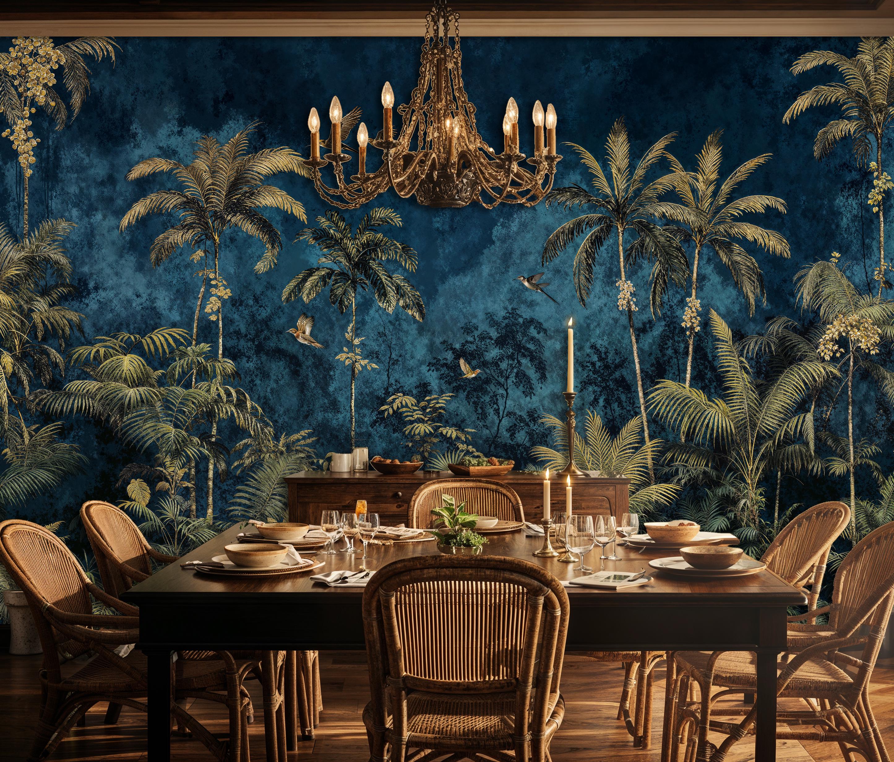 Transform your space into a breathtaking oasis with this Luxurious Dark Blue Forest Wallpaper. Elega...