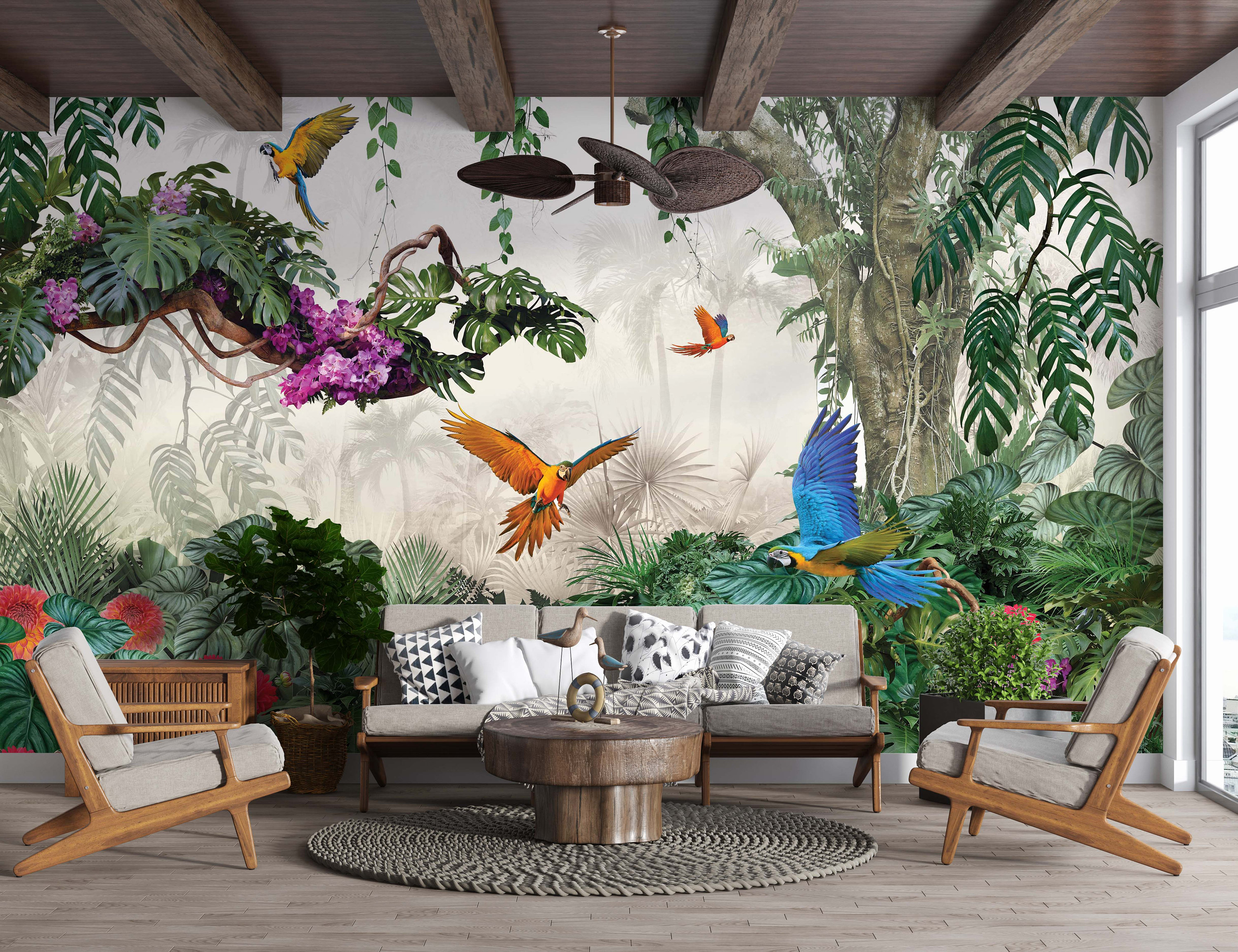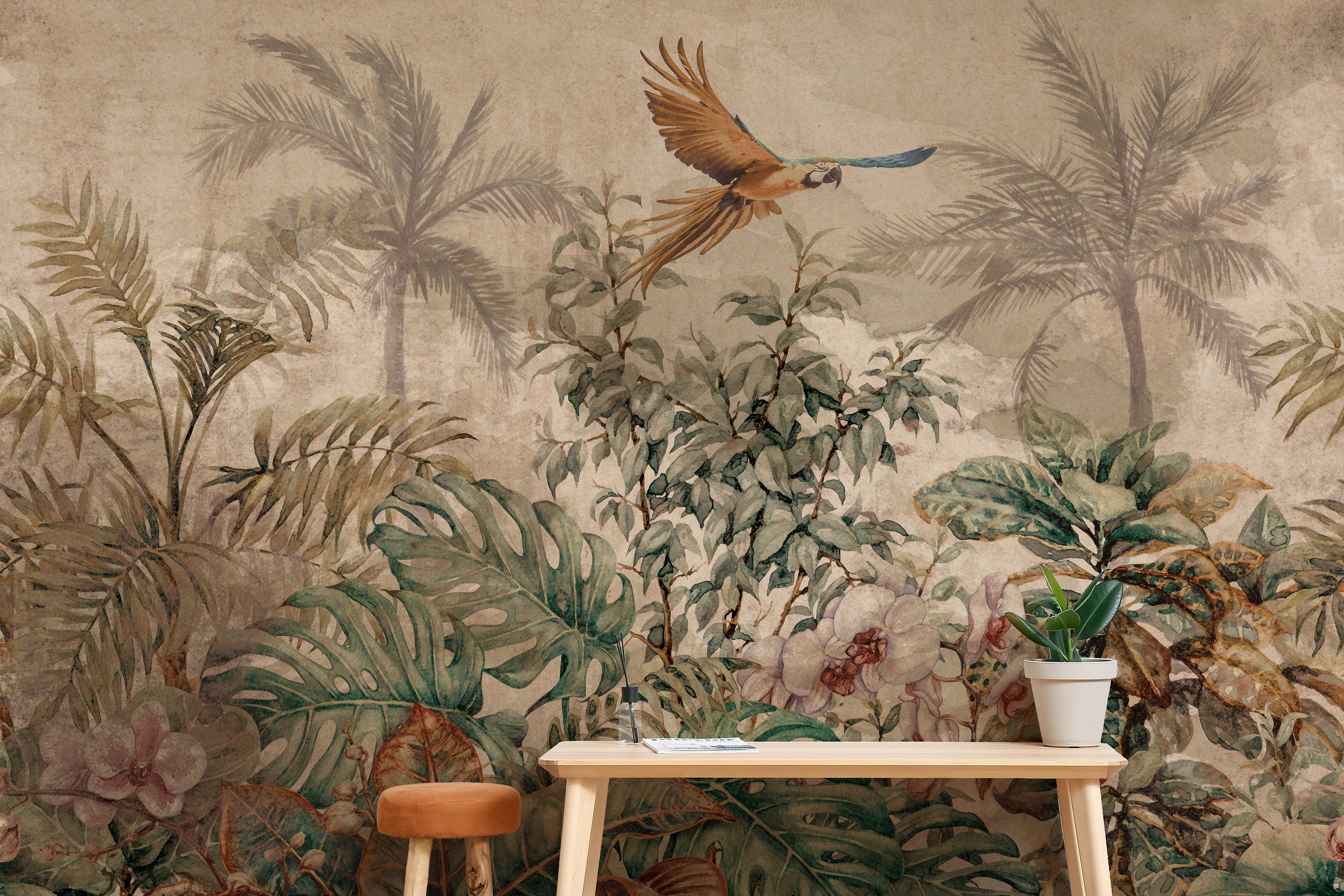 "Escape into a vintage-inspired rainforest with this beautifully designed wallpaper mural featu...