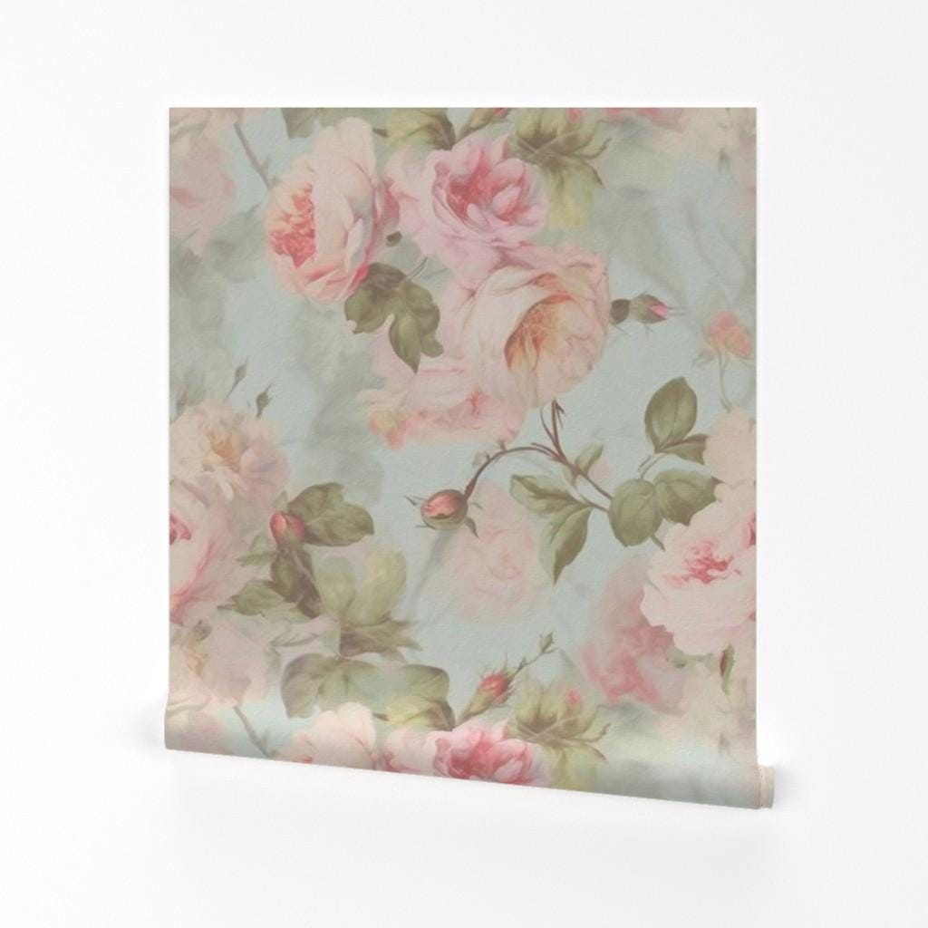 Vintage French roses wallpaper, Shabby Chic Wallpaper, Blush Pink Rose Temporary Wall Art, Country P...