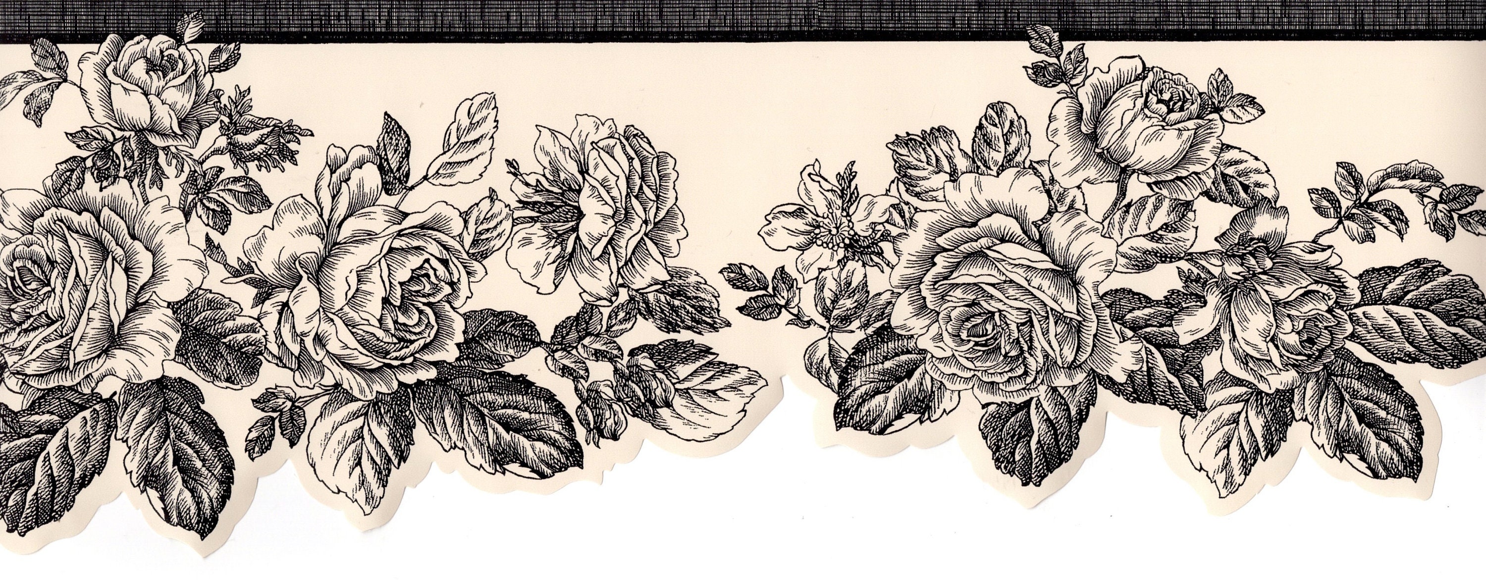 Cottage Rose Wallpaper Border, Vintage Black Line Rose Wallpaper, V...