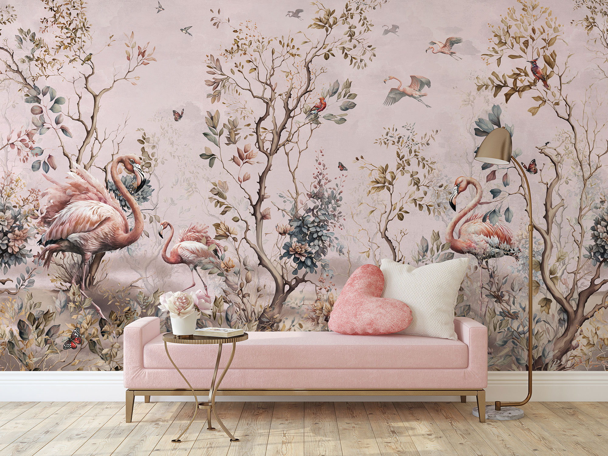 Pink Flamingo Chinoiserie Wallpaper, Trees & Birds Botanical Wa...