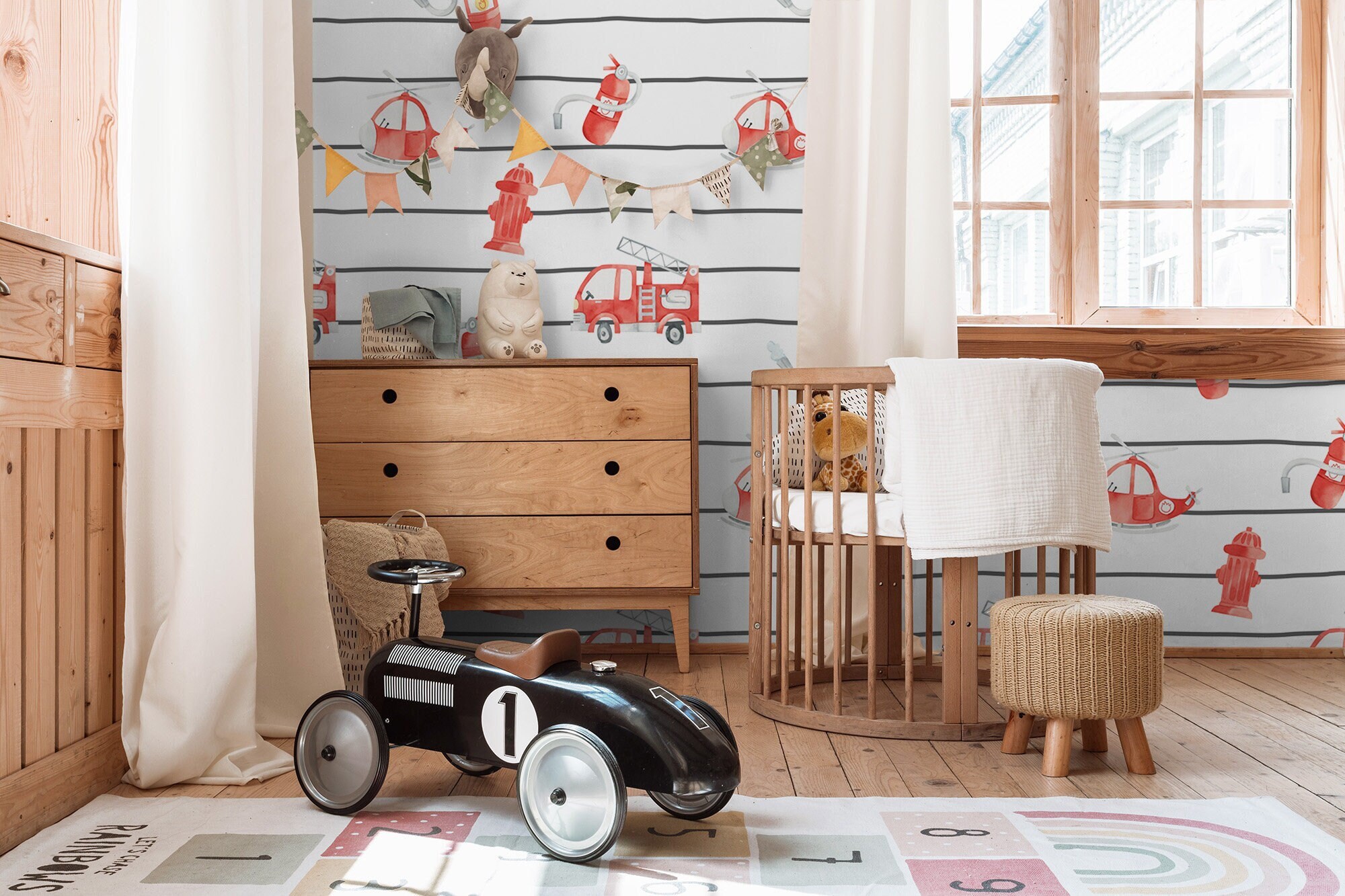 Watercolor striped wallpaper with fire trucks, Removable, Nursery W...