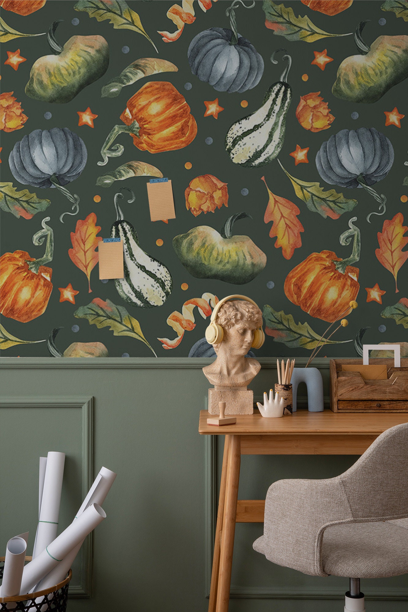 Wallpaper with autumn leaves and pumpkin, Wall Mural, Self Adhesive...