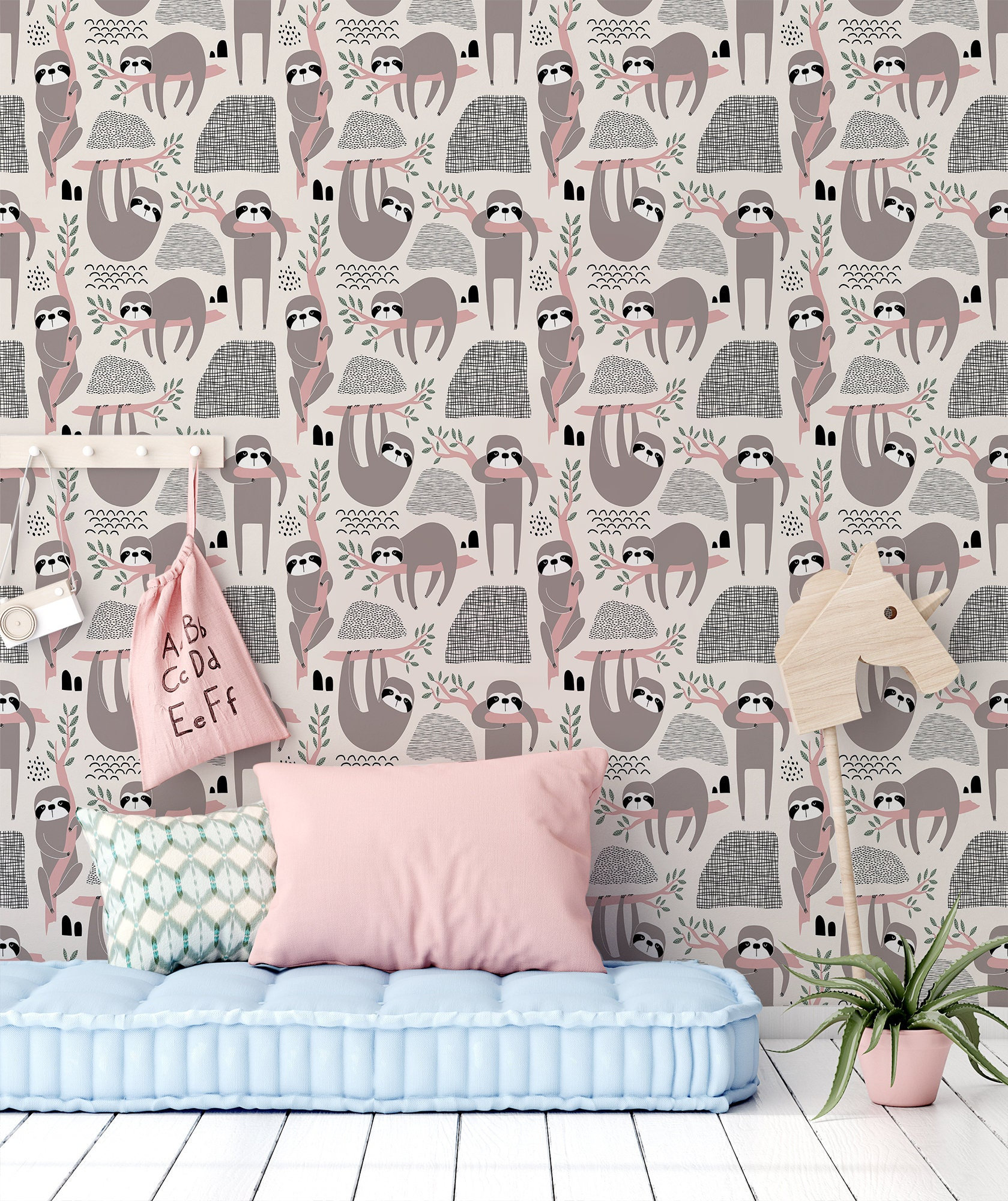 Sloth animal wallpaper, leaf pattern, Wall Art, Nursery Wall Mural,...