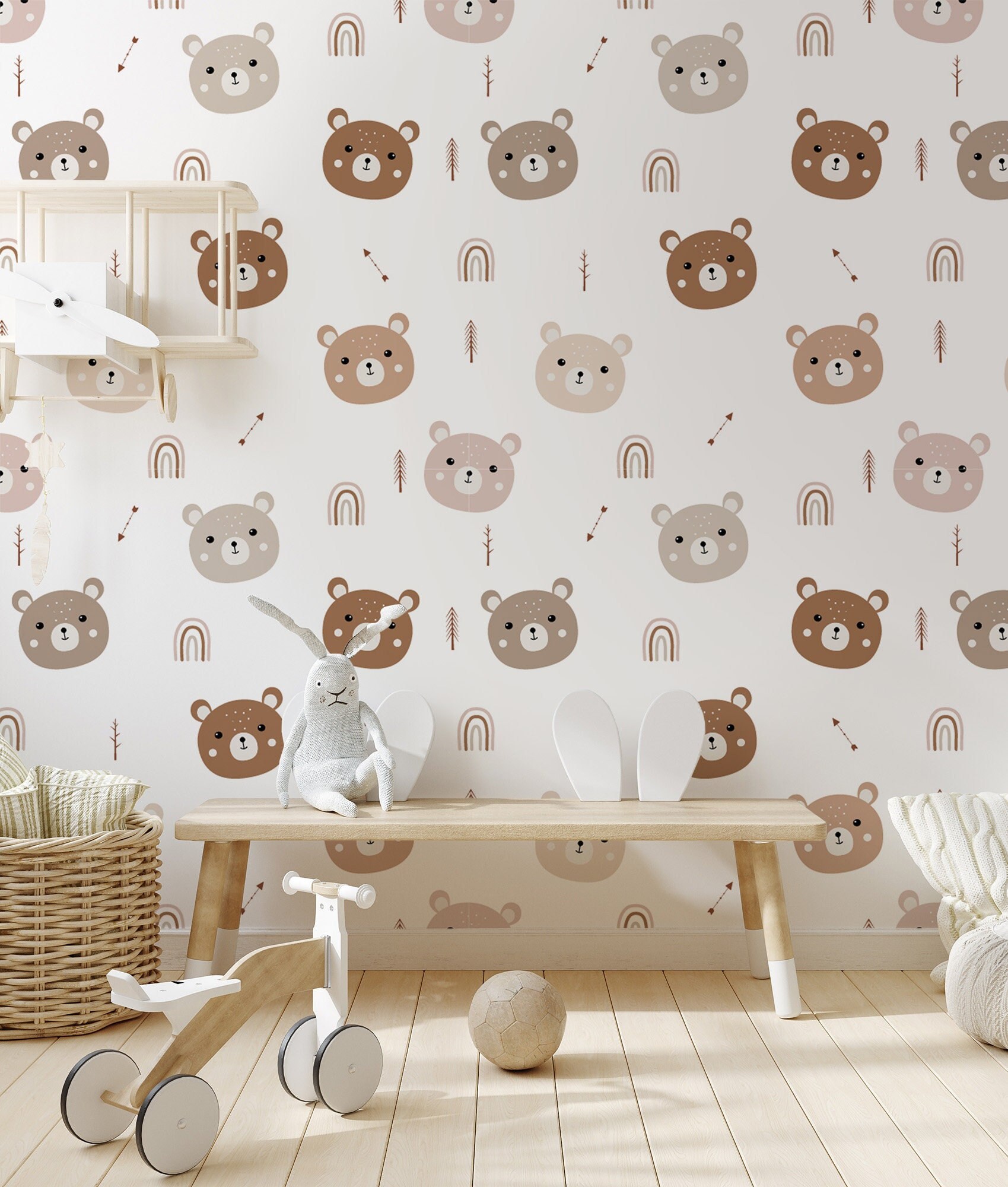Cute bear, Boho animal wallpaper, removable, Nursery Wall Art, Self...