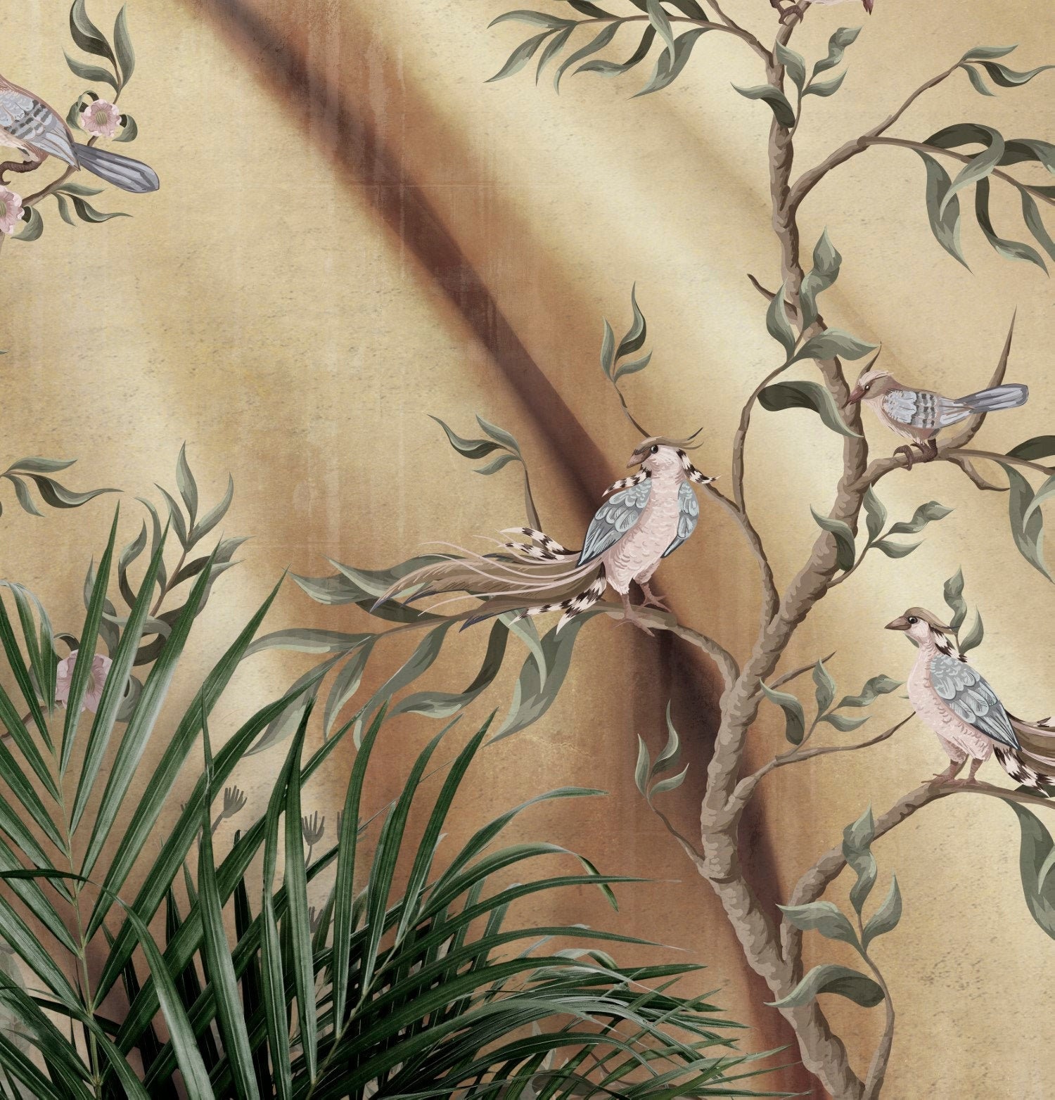 "Chinoiserie Flowers and Birds Wallpaper, Gold Birds, Peel and Stick Mural Poster Classic Art L...