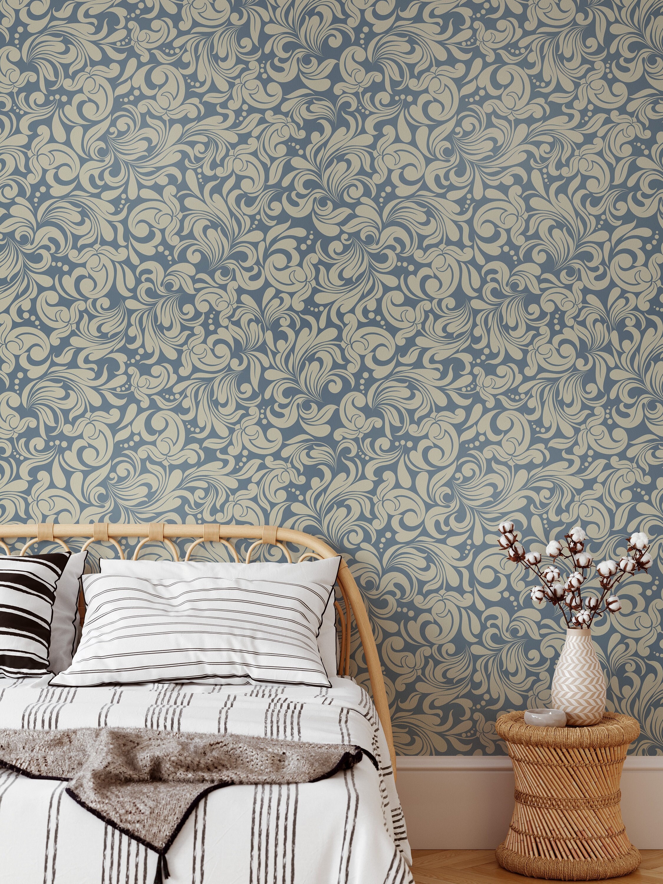 Blue and Beige Damascus Wallpaper, Luxury Light Beige and Blue Wall...