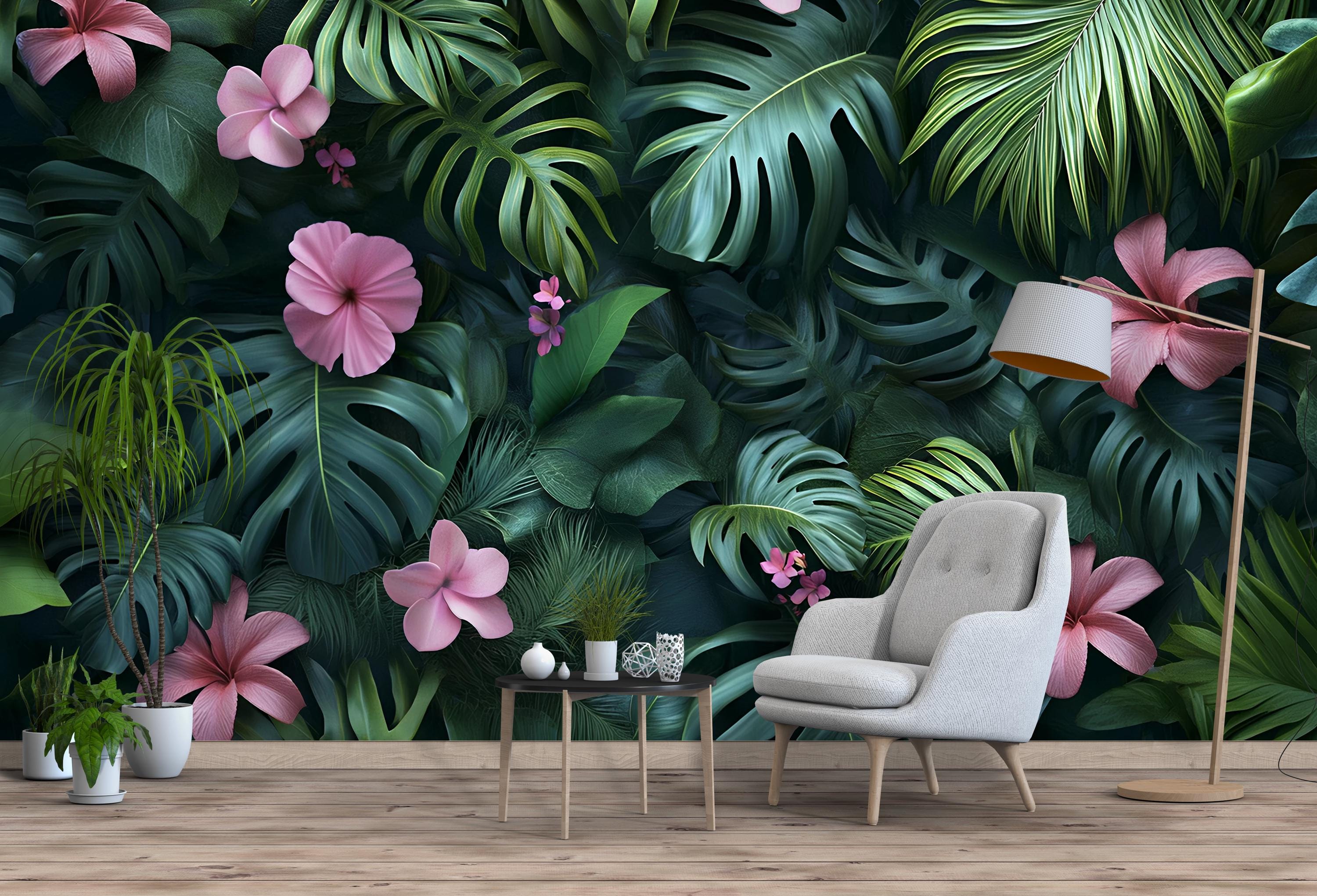 3D texture Tropical Jungle Floral Wallpaper - Botanical Leaf Wall Mural - Pink Hibiscus Peel and Sti...