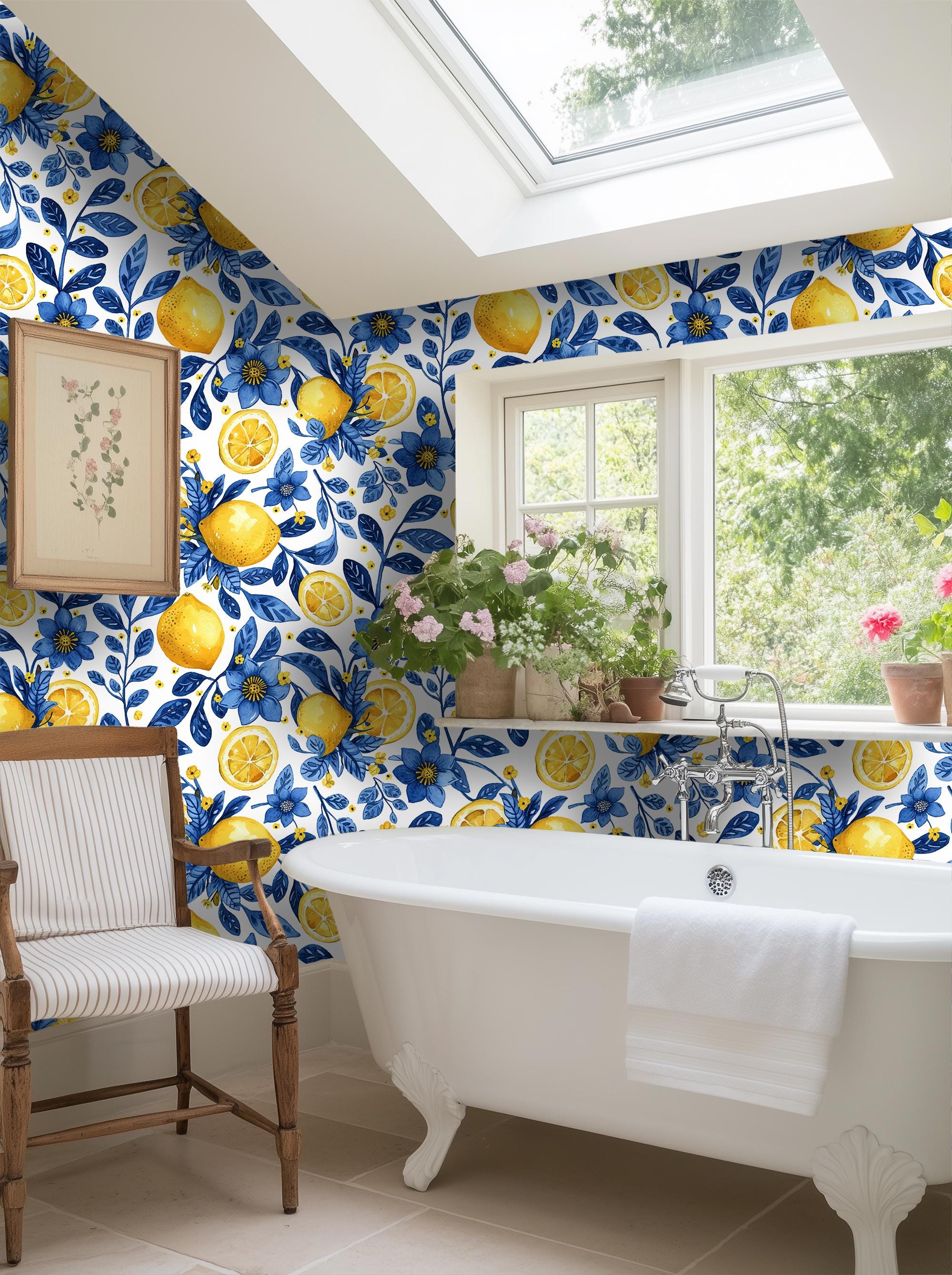 Lemon Floral Wallpaper,Citrus Mural Peel and Stick,Blue Yellow Tiles wall Decor,Mediterranean Summer...
