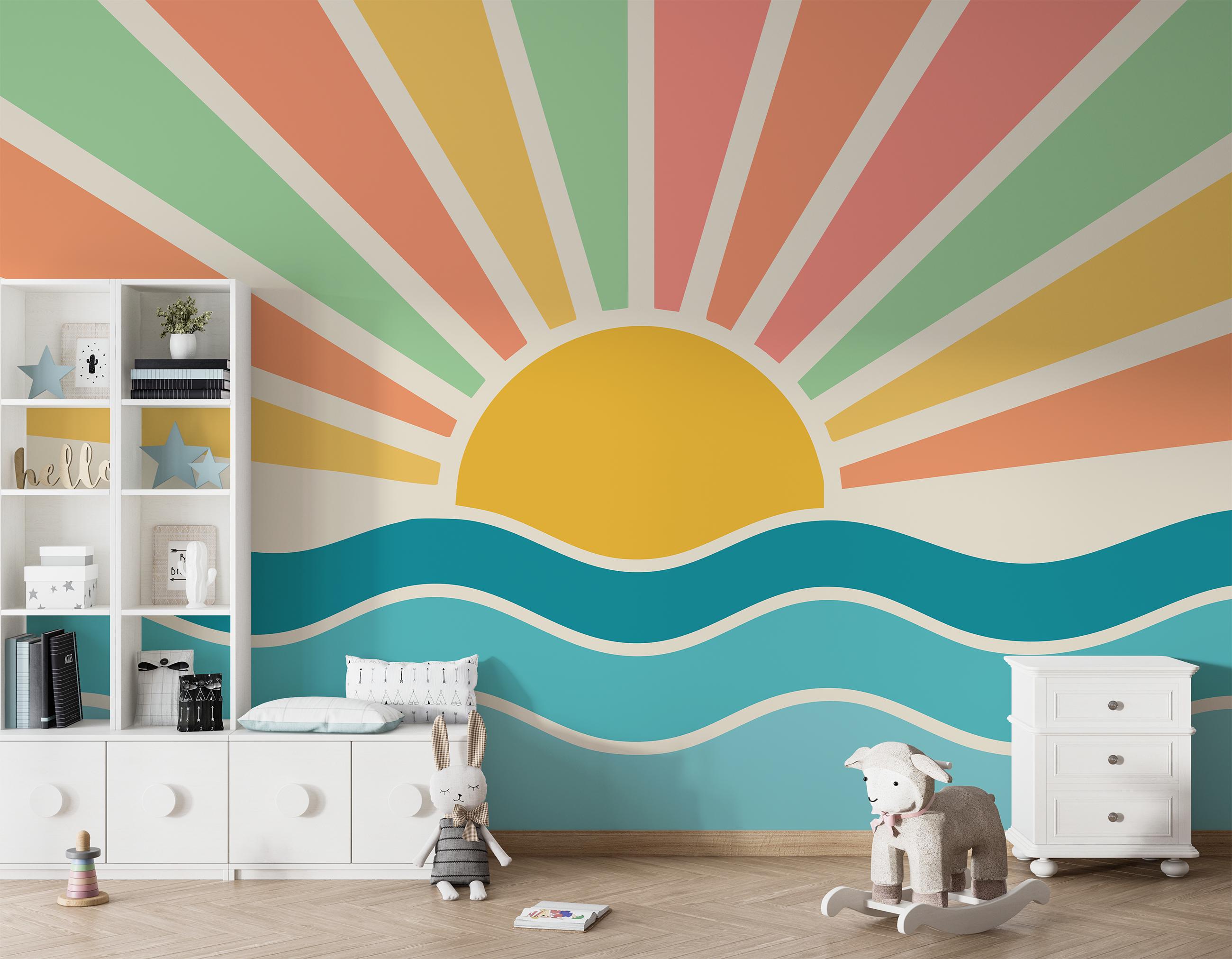 Retro Sunrise Wall Mural. Featuring a bold yellow sun rising above flowing teal waves with soft past...