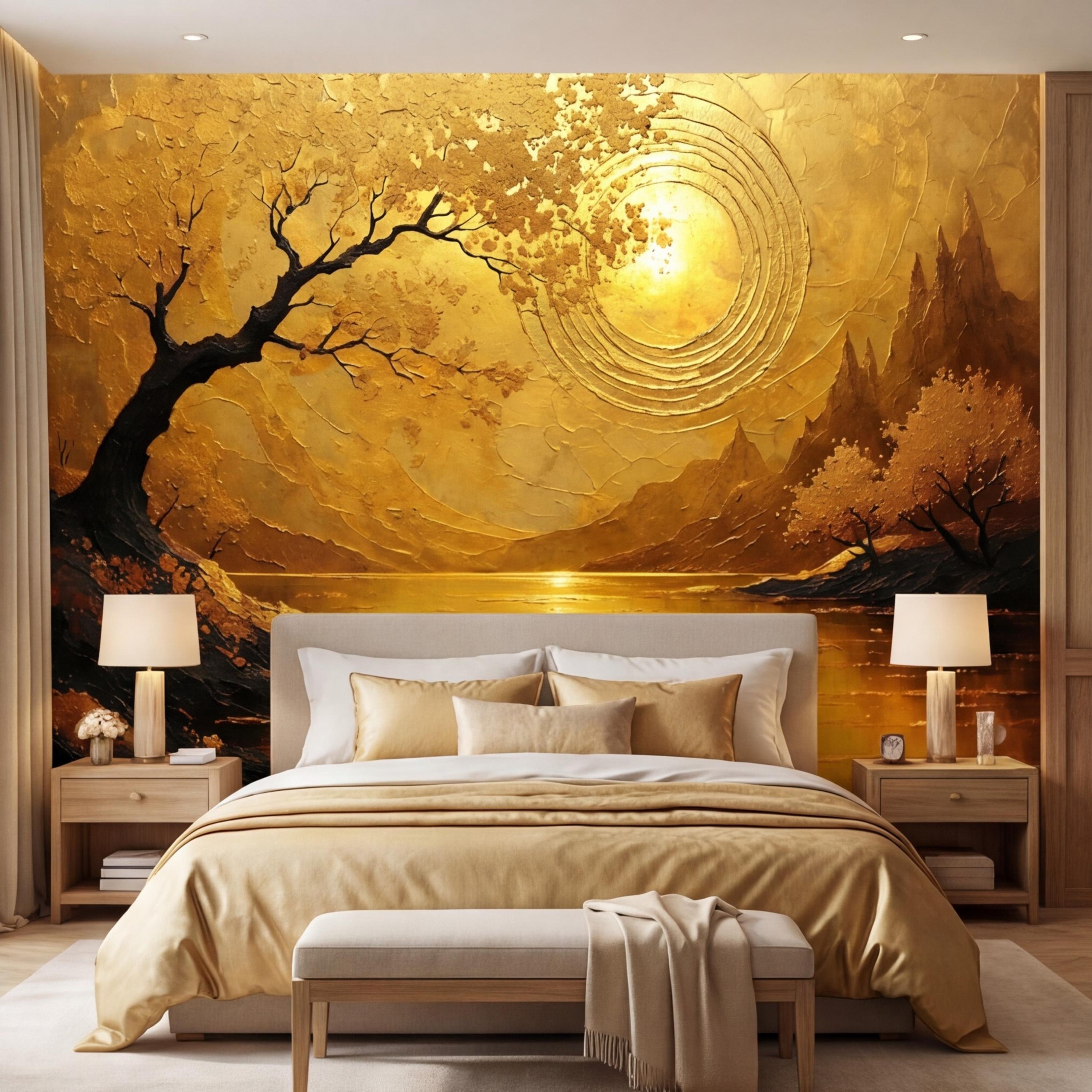 Gold Sunset Lake Tree Sun Peel and Stick Wall Mural, Textured Lands...