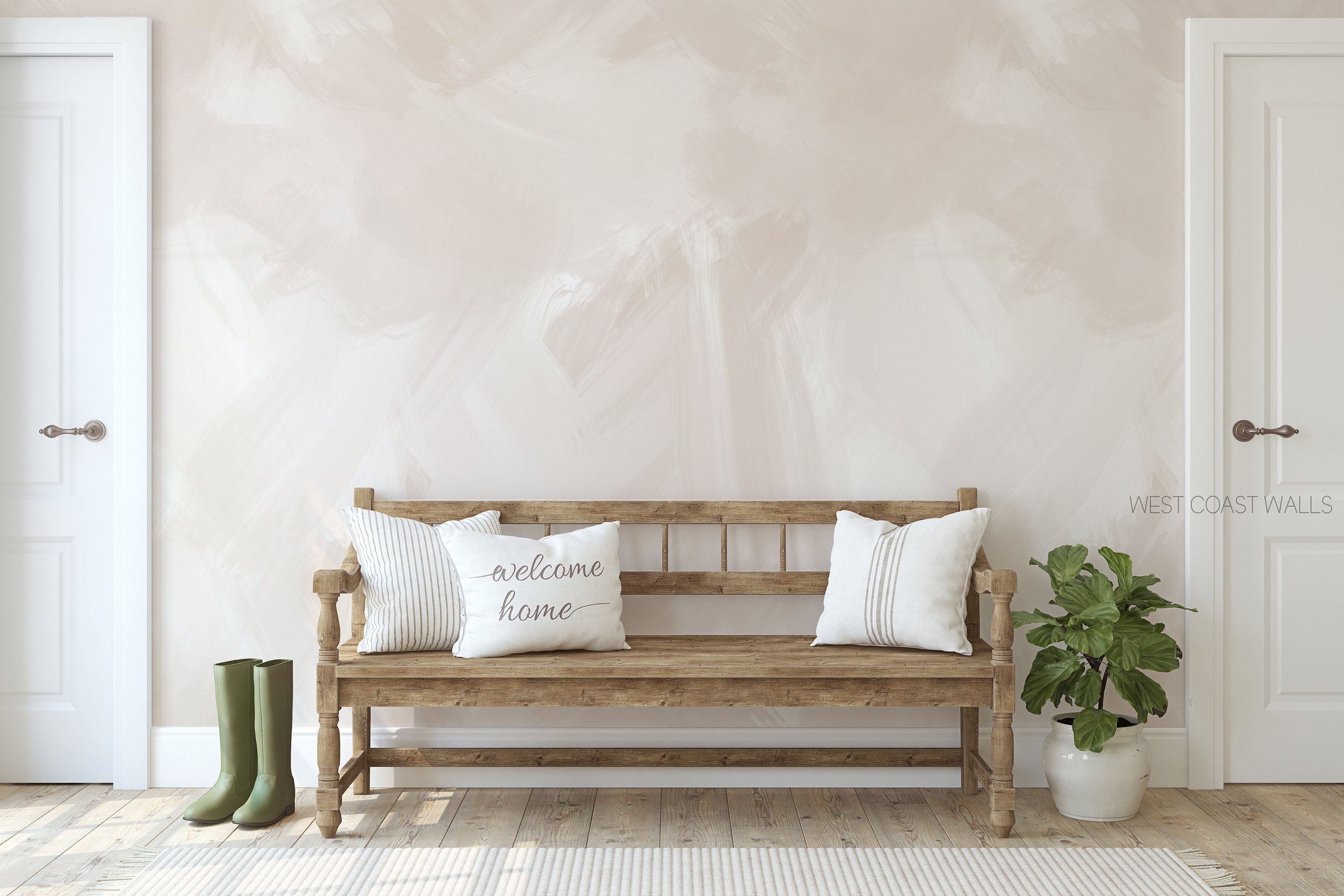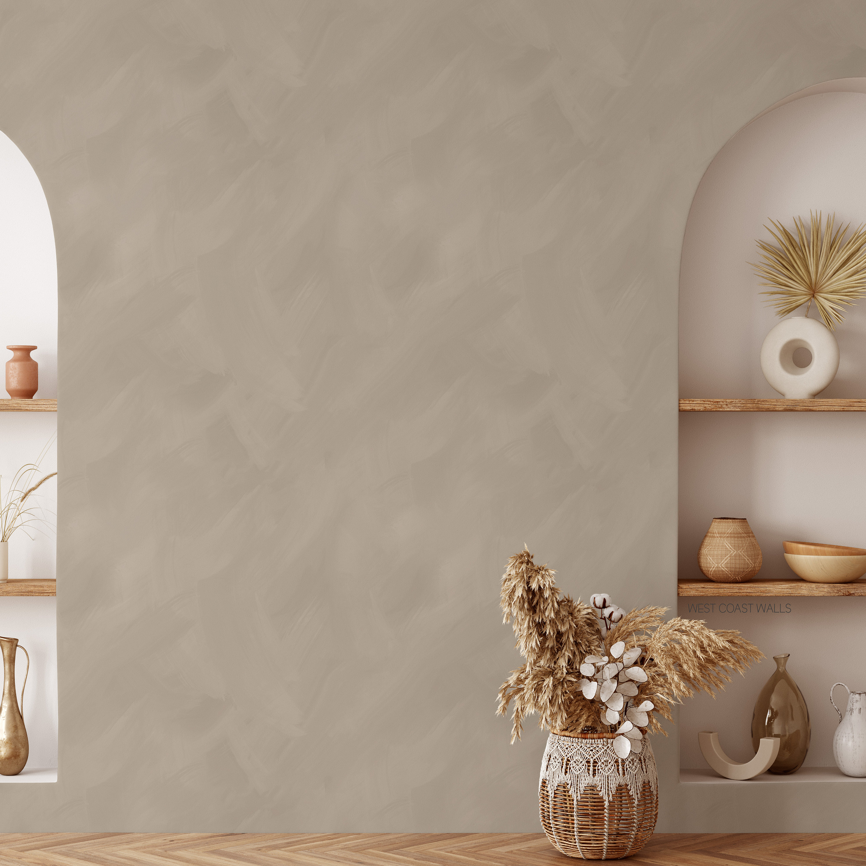 "This wallpaper features a handpainted, brush stroke design in a lime wash style, with taupe to...