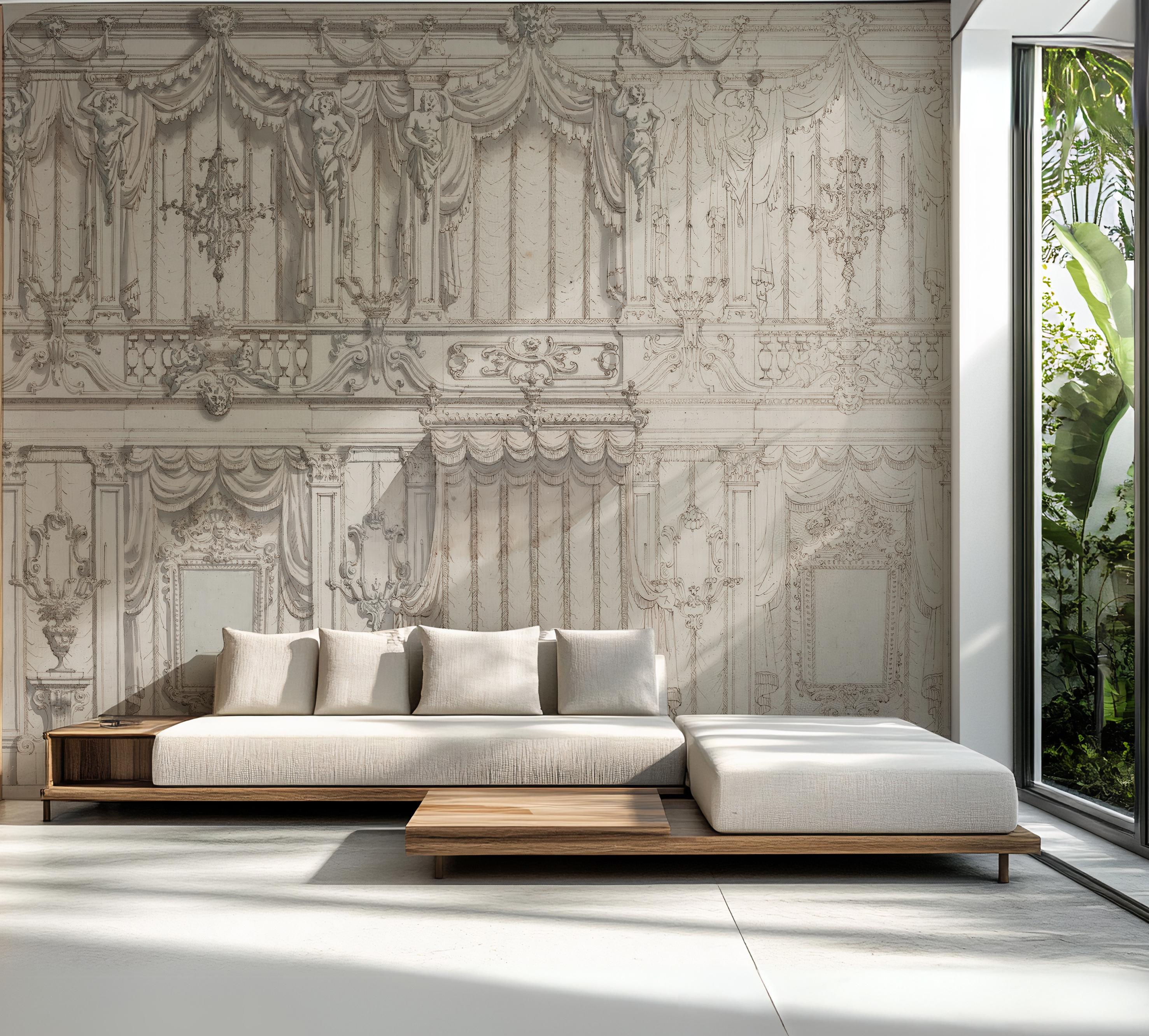 "Vintage Theatre Facade Beige Wallpaper is an elegant wallpaper inspired by the classic archite...
