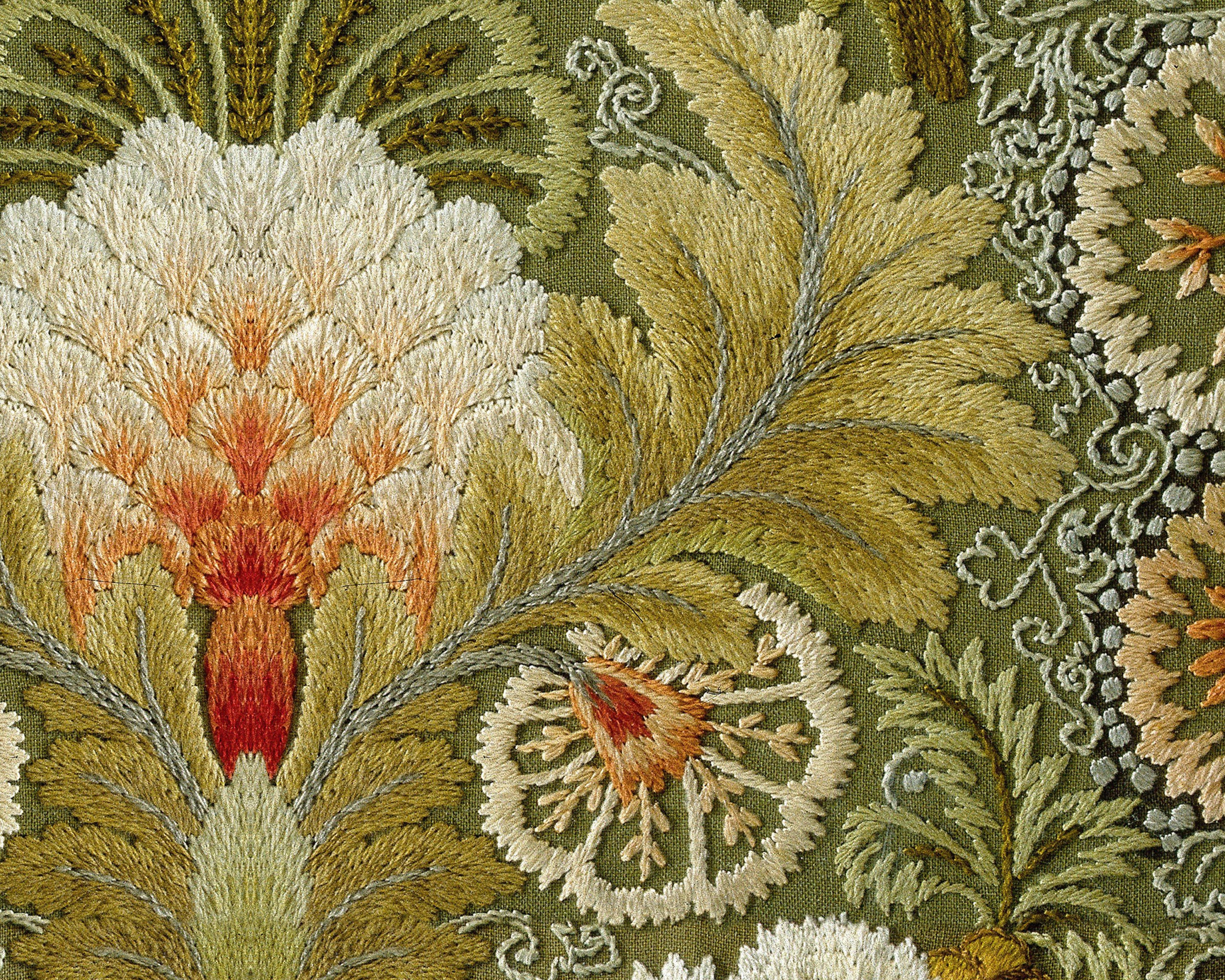 "Embroidered threads create a vivid desert landscape, with layered mountains, bold cacti, and s...