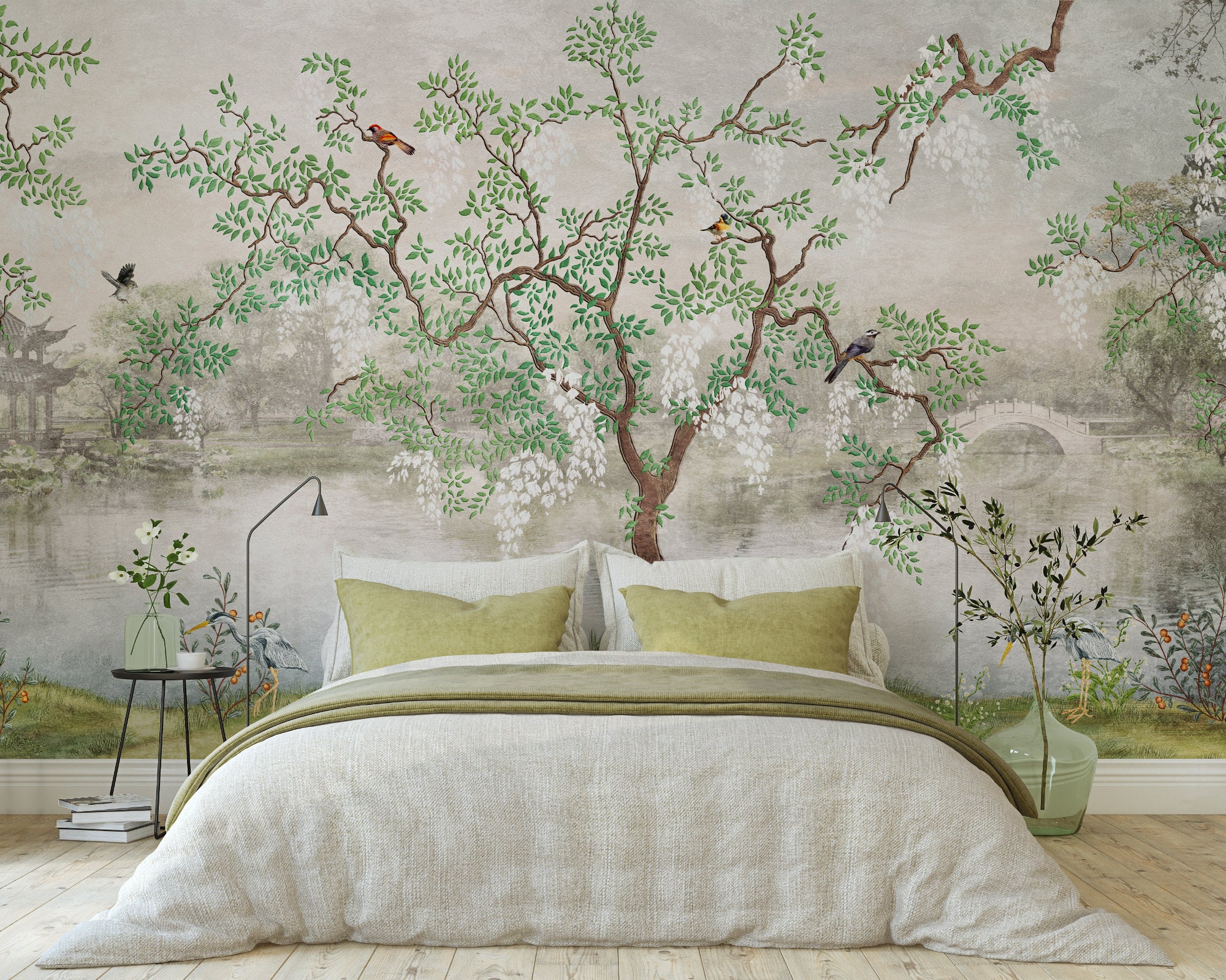 White Silk Chinoiserie Wallpaper - Chinoiserie Garden Mural for Art...