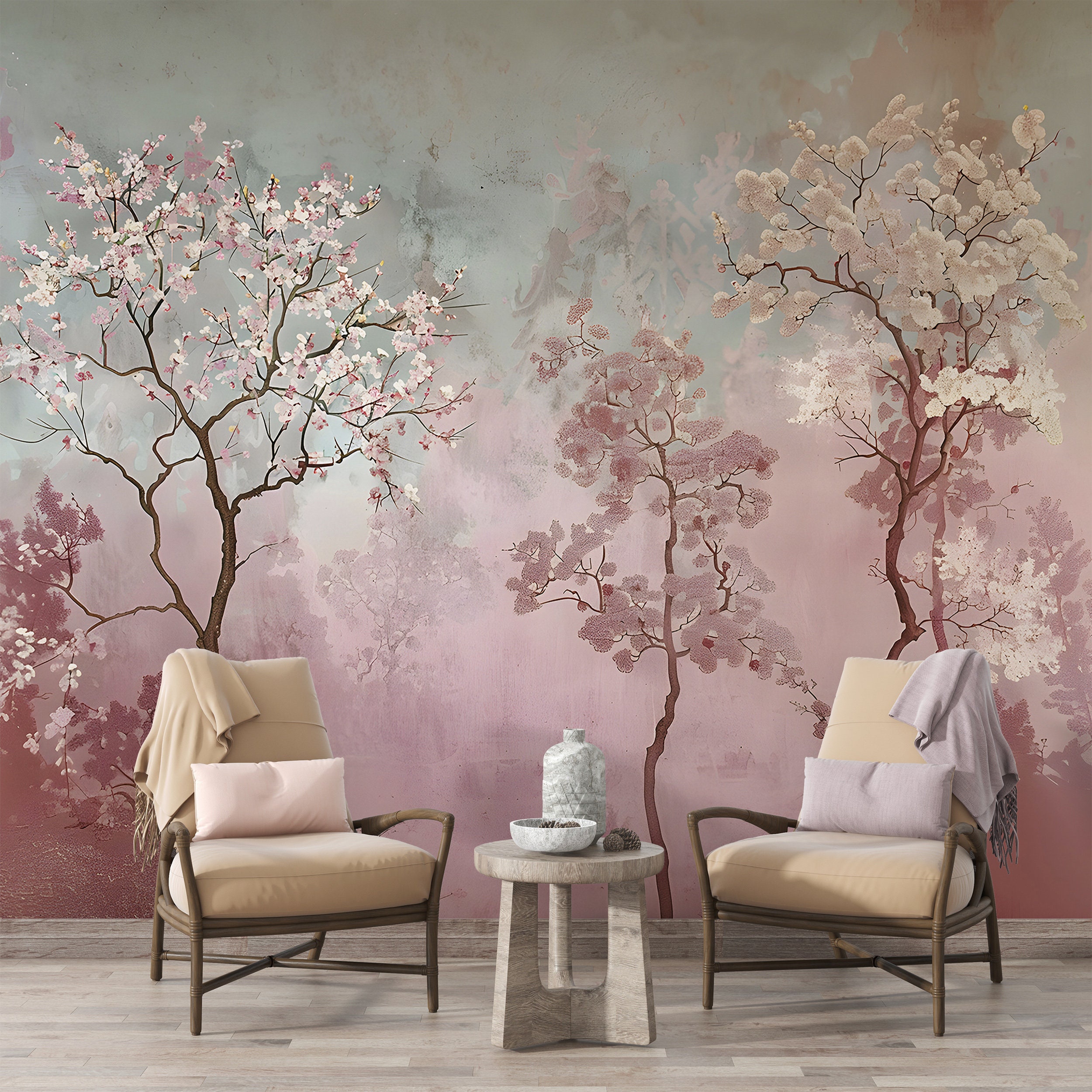 Enhance your home with the serene beauty of Muted Colors Trees Wallpaper. This soft pink watercolor ...
