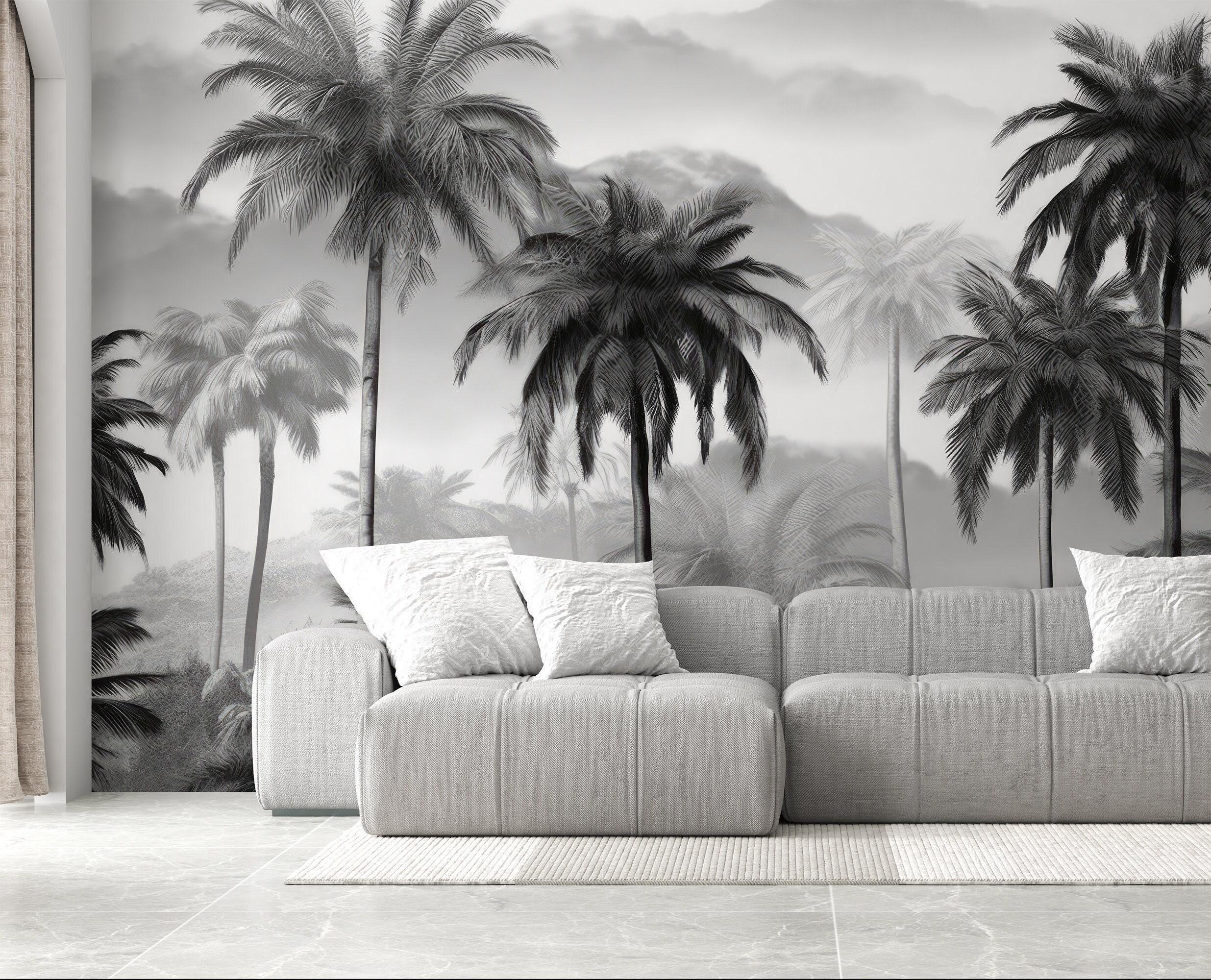 "Create a striking contrast in your decor with our Black and White Palm Trees Illustration Wall...