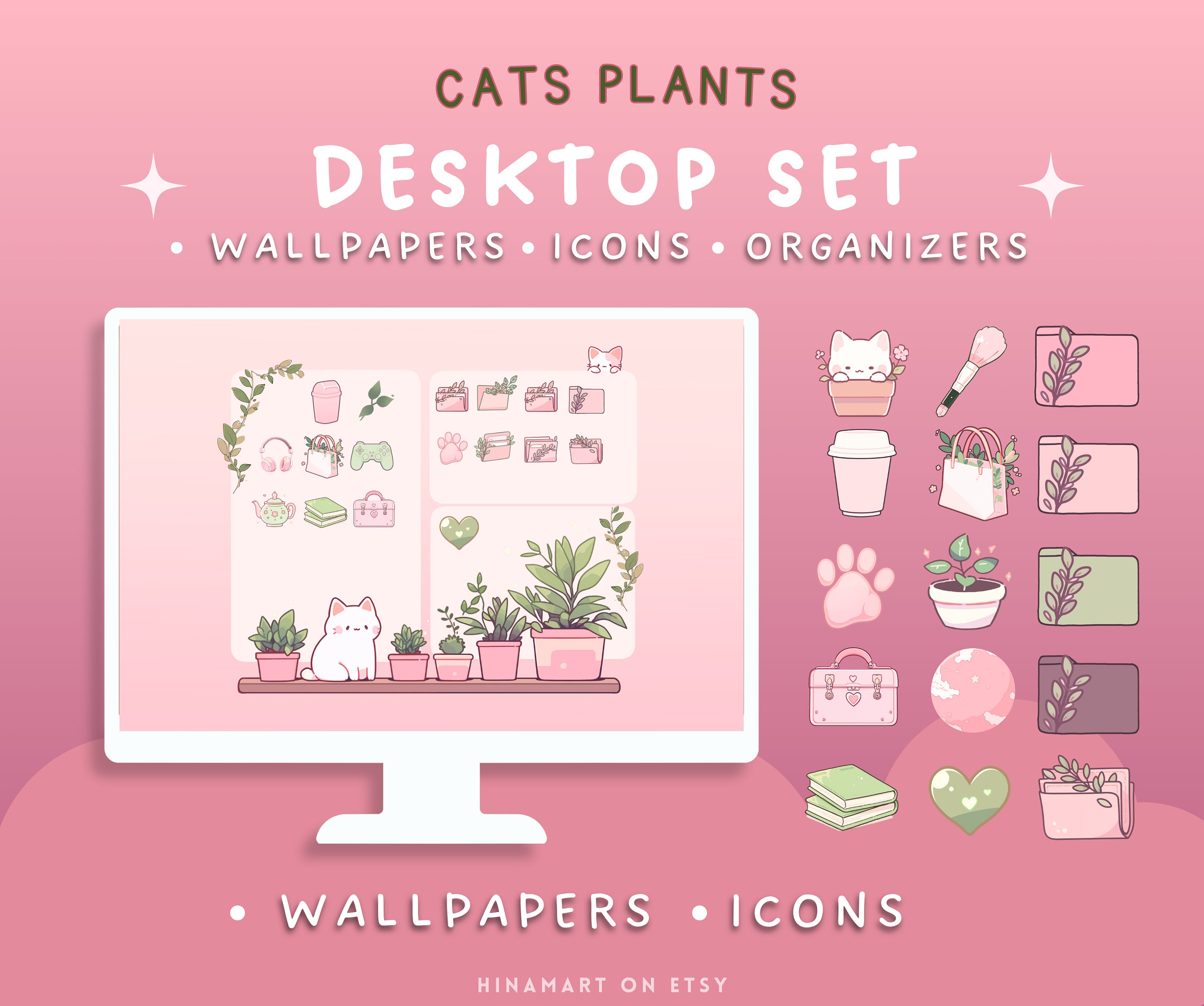 Brighten up your desktop with this adorable cat plant desktop wallpaper and icon setCustomize your i...