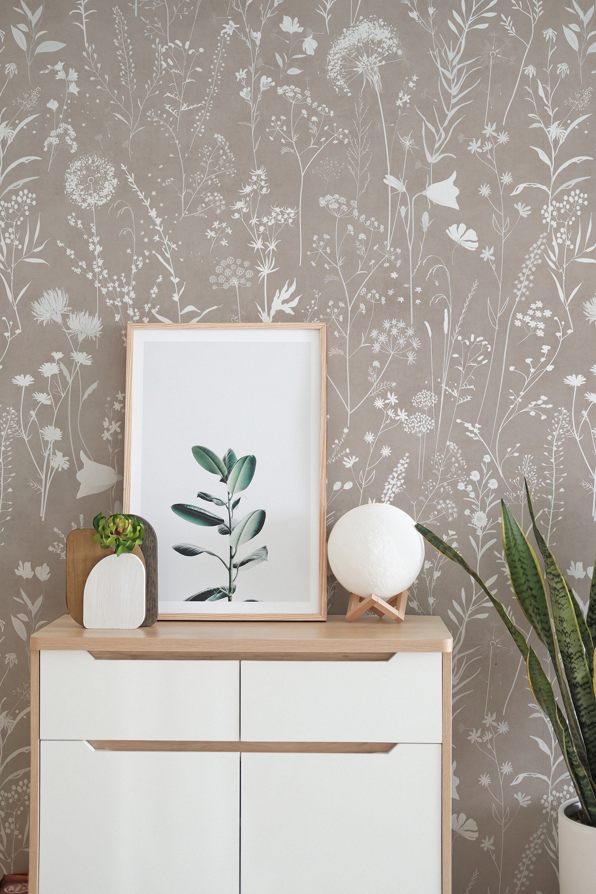 Wild Plants Art Wallpaper Peel and Stick | Meadow Plants Wall Mural | Neutral Color Wild Flowers Art...