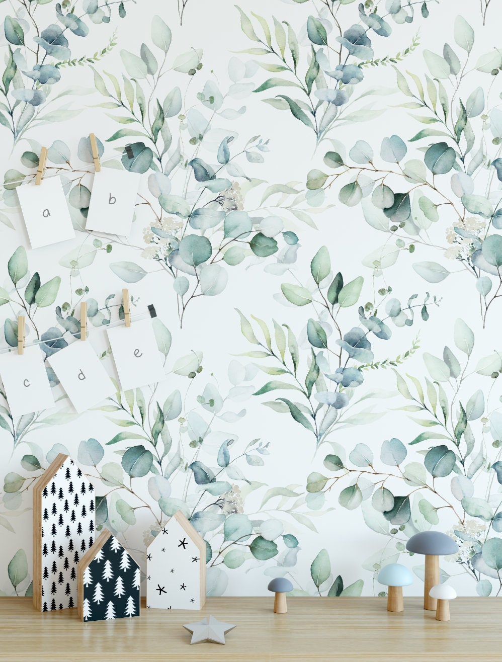 "This beautiful eucalyptus wallpaper features a watercolor design and is exclusive to West Coas...
