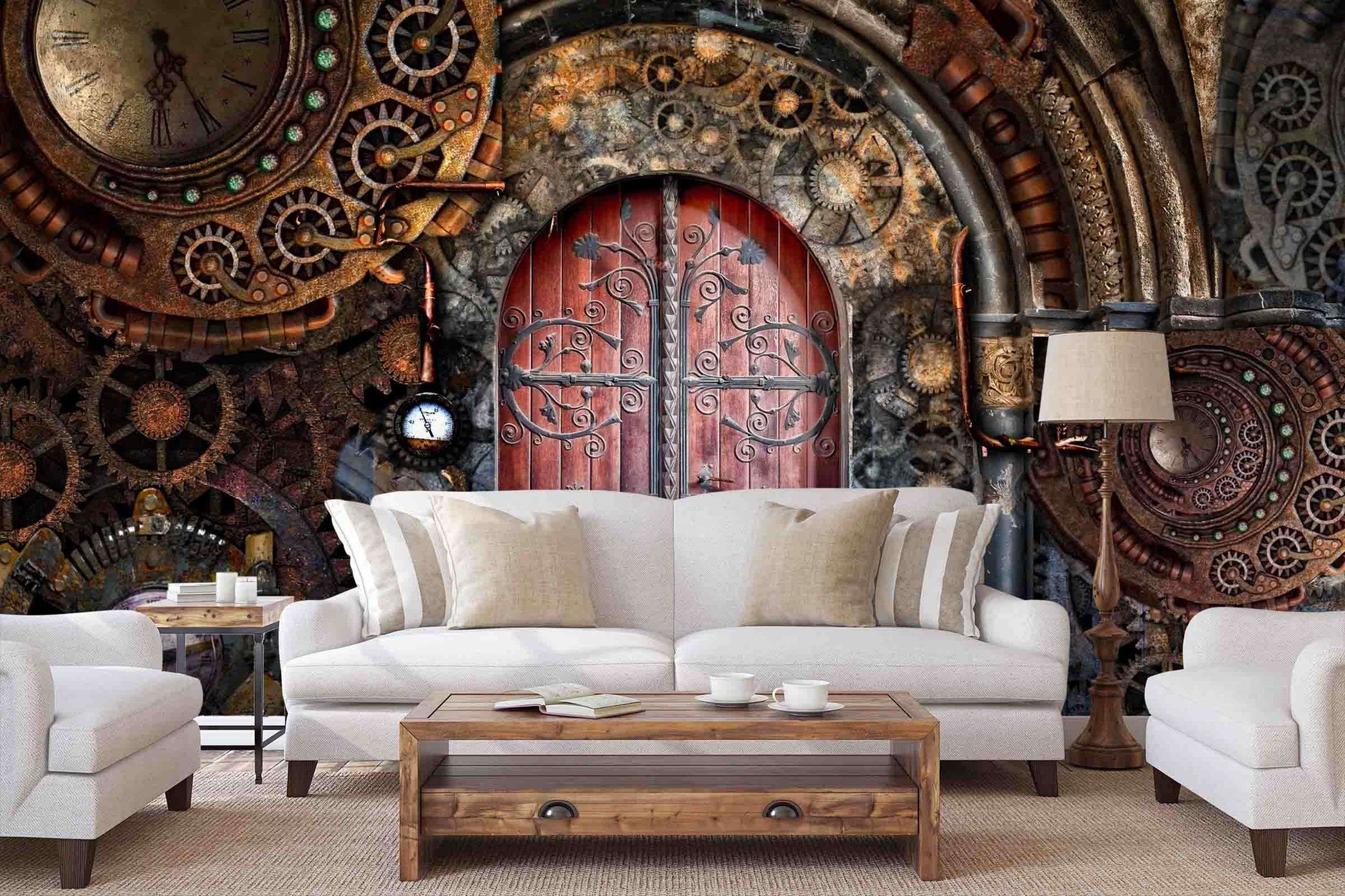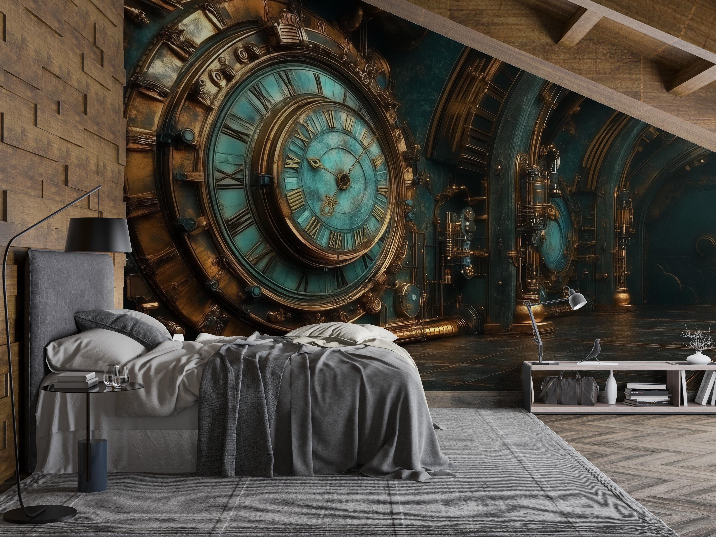 Steampunk Control Room Wallpaper, Bold Industrial Clock Wall Mural,...