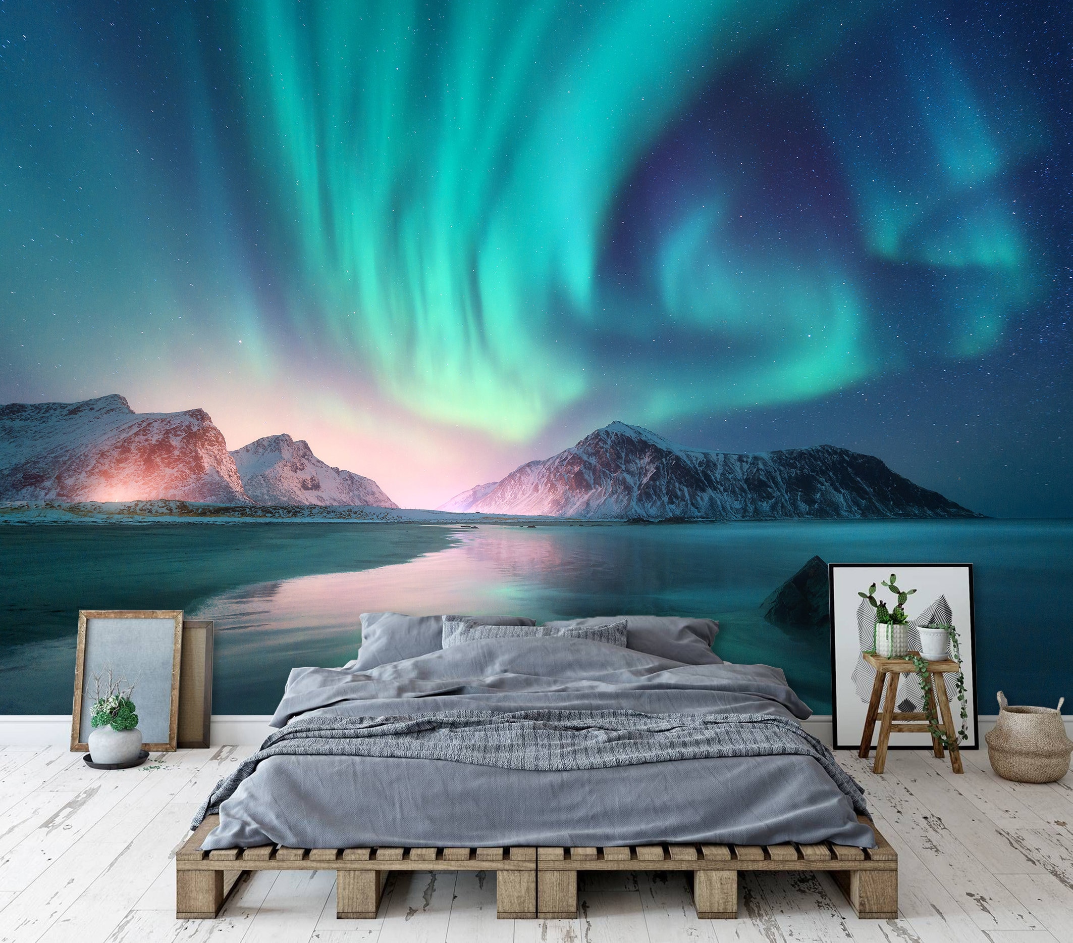 "Northern lights wallpaper Nature wall mural Scenery covering polar lights Removable print bedr...