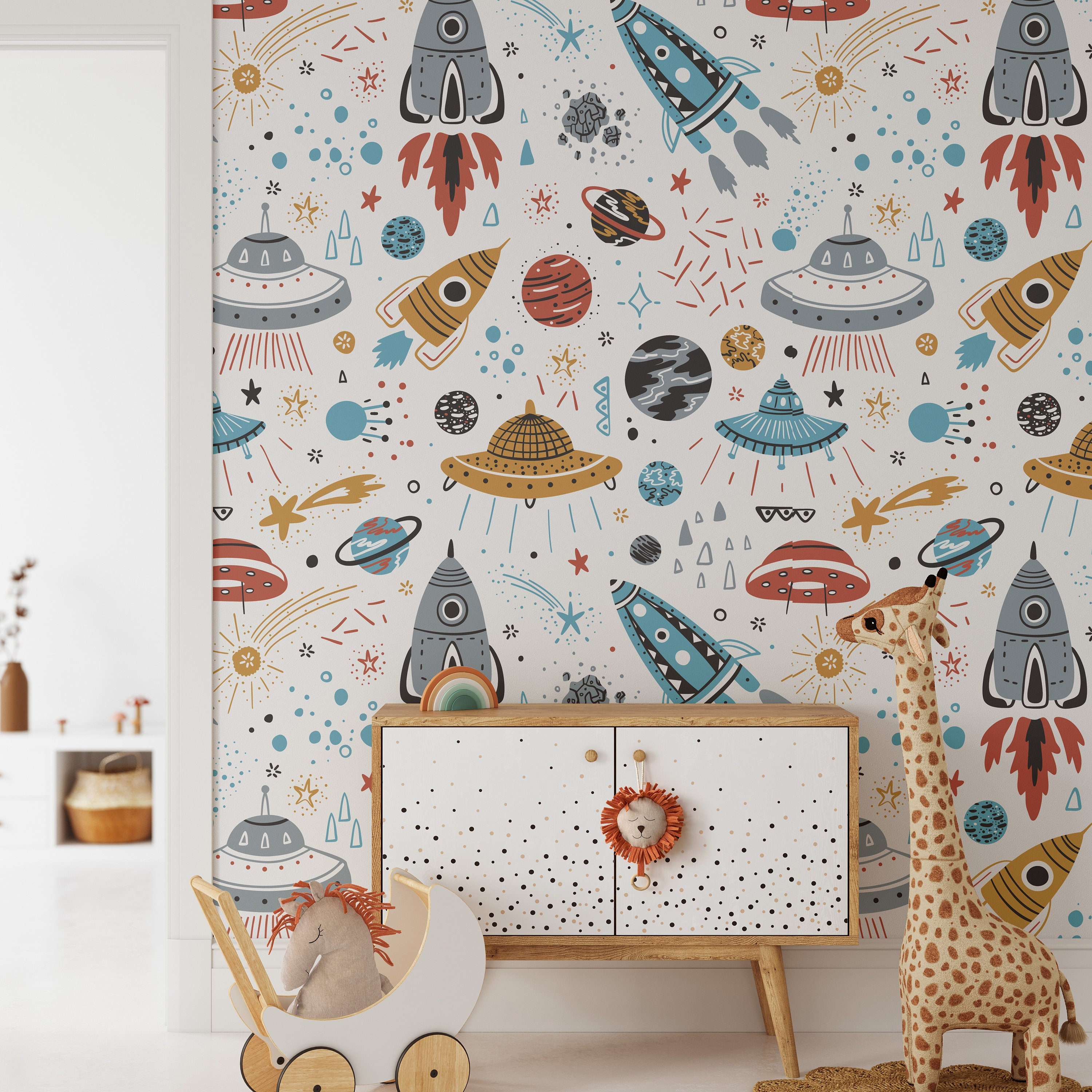 Space Rocket Kids Room Wallpaper, Baby Room Decor, Children Wallpap...