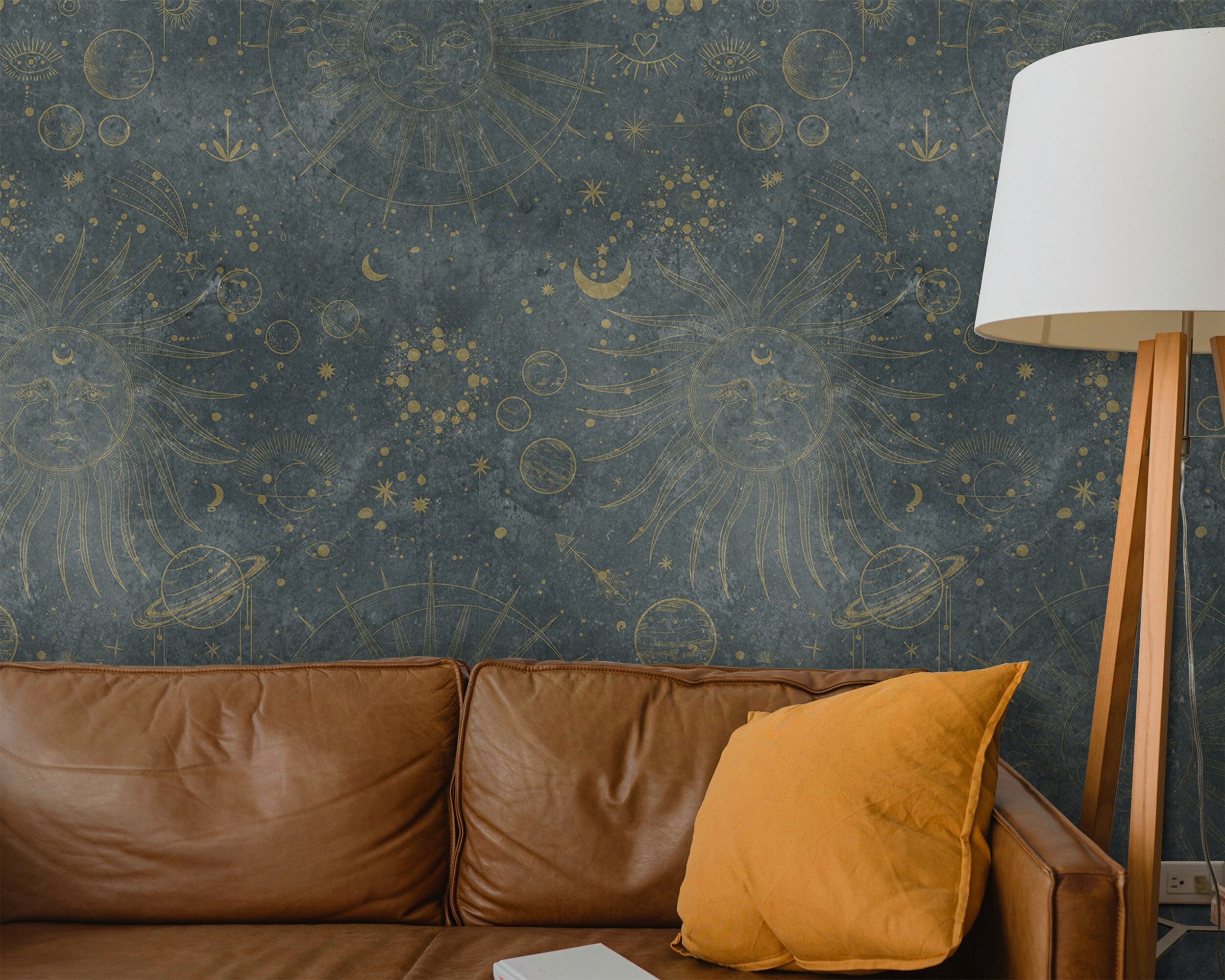 Wall Covering, Moon Phases Wallpaper, Blue Wallpaper, Yellow Wallpa...