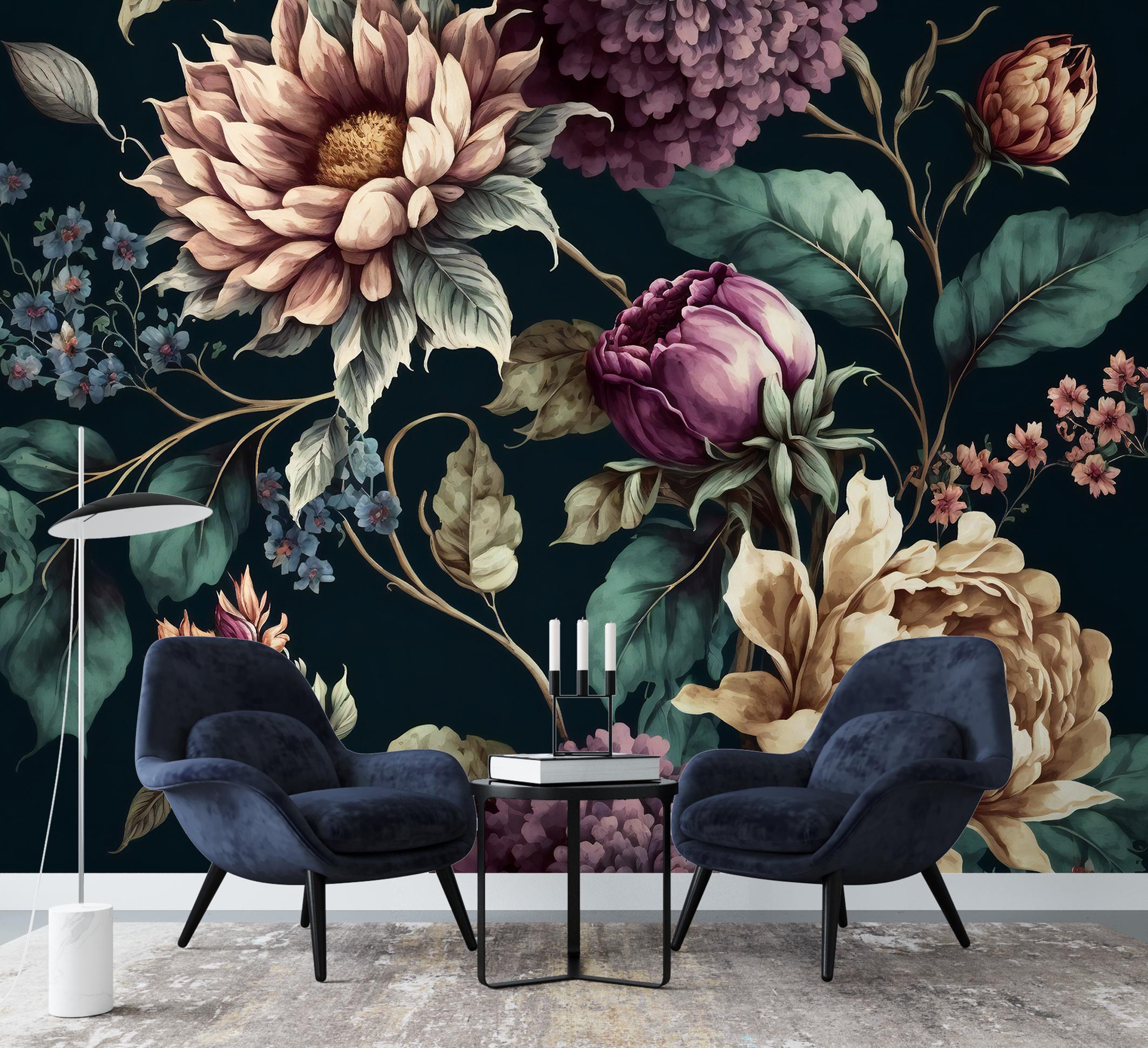 Dark Floral Wallpaper Mural Large Flower Buds Wallpaper Peel and St...