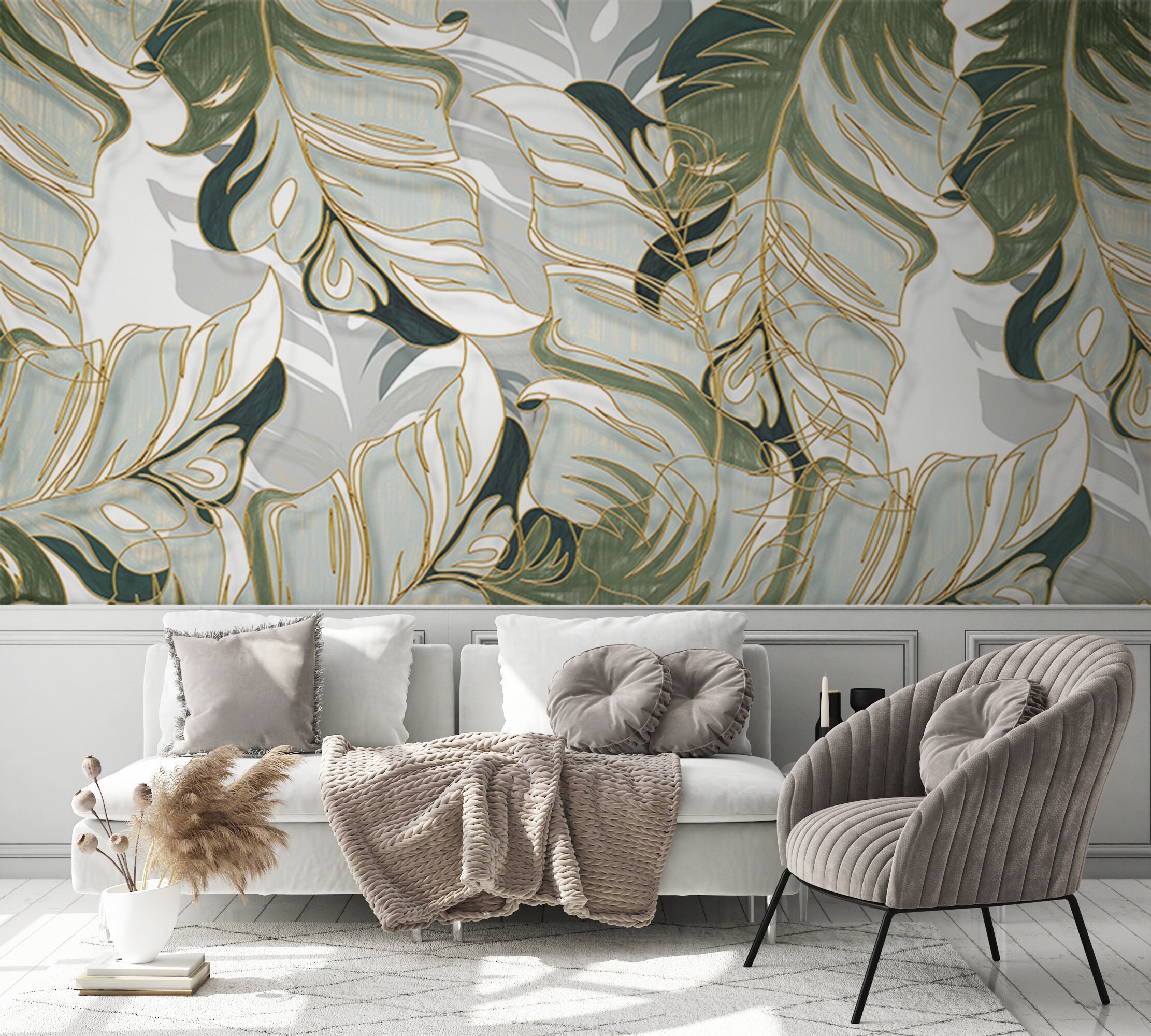 Gray White and Light Green Watercolor Exotic Leaves Wallpaper Self ...
