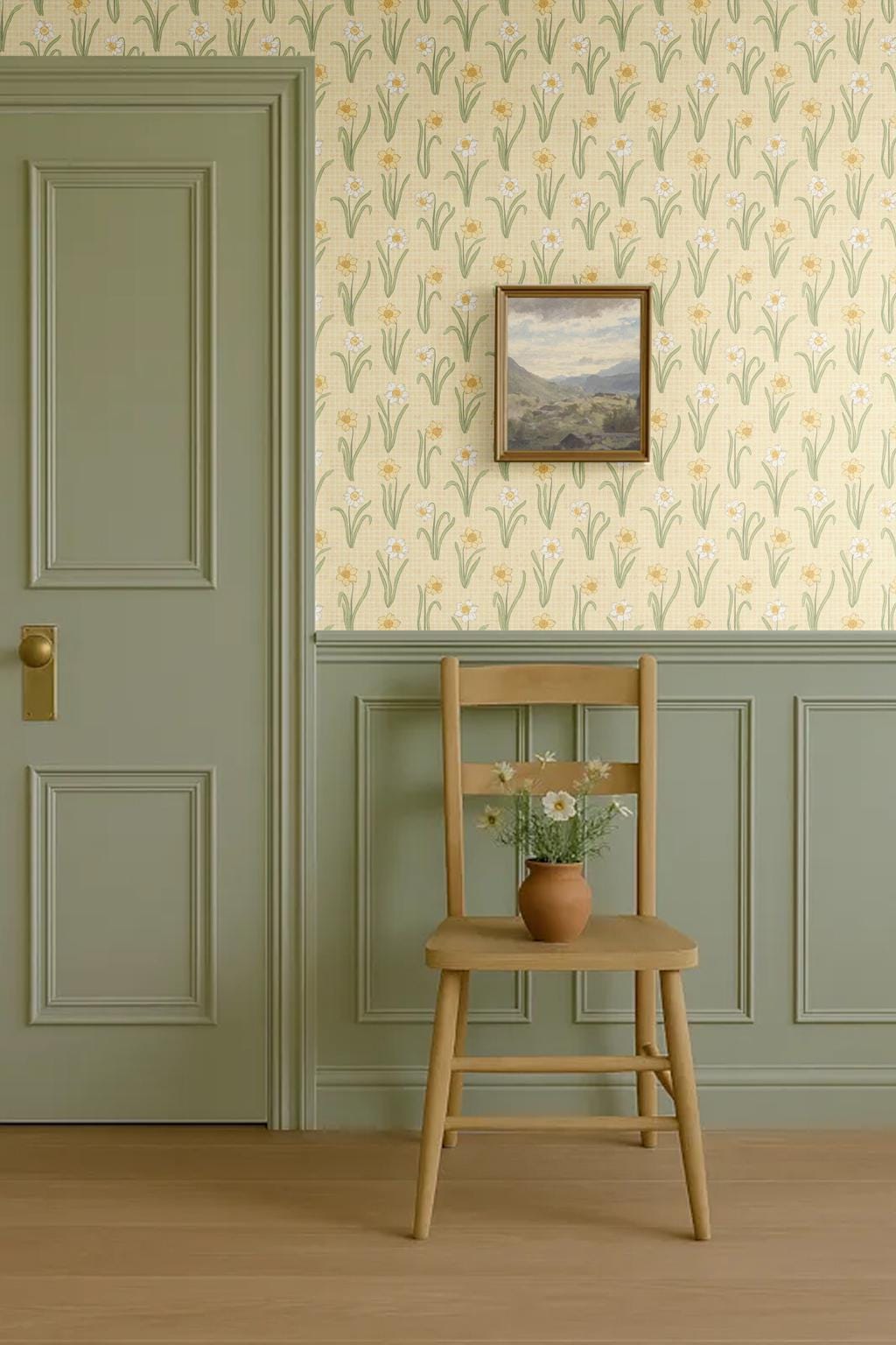 "This soft daffodil wallpaper in the viral butter yellow color of 2025 features sunny daffodils...