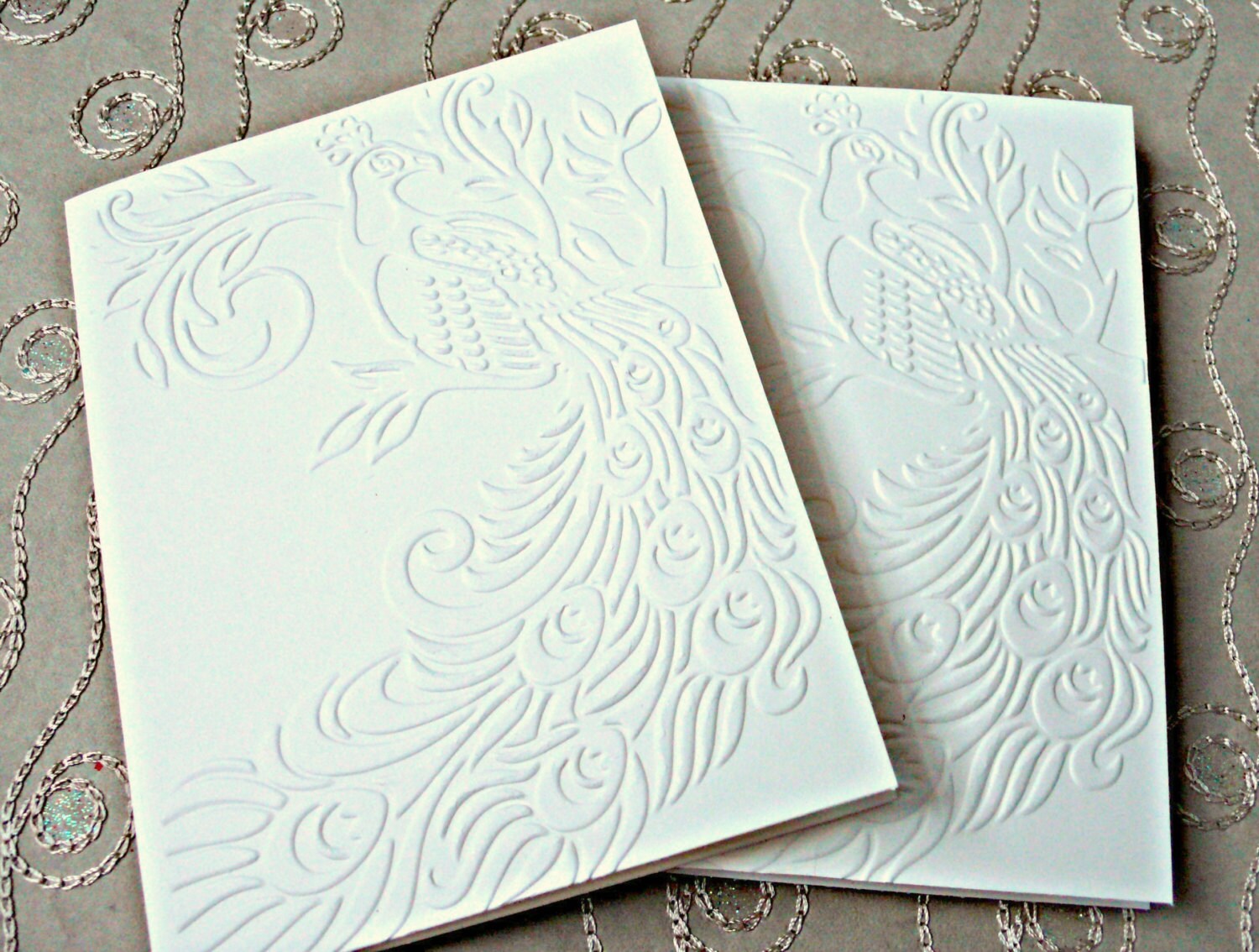 "This is a set of embossed notecards with a beautiful peacock design available in white, black ...