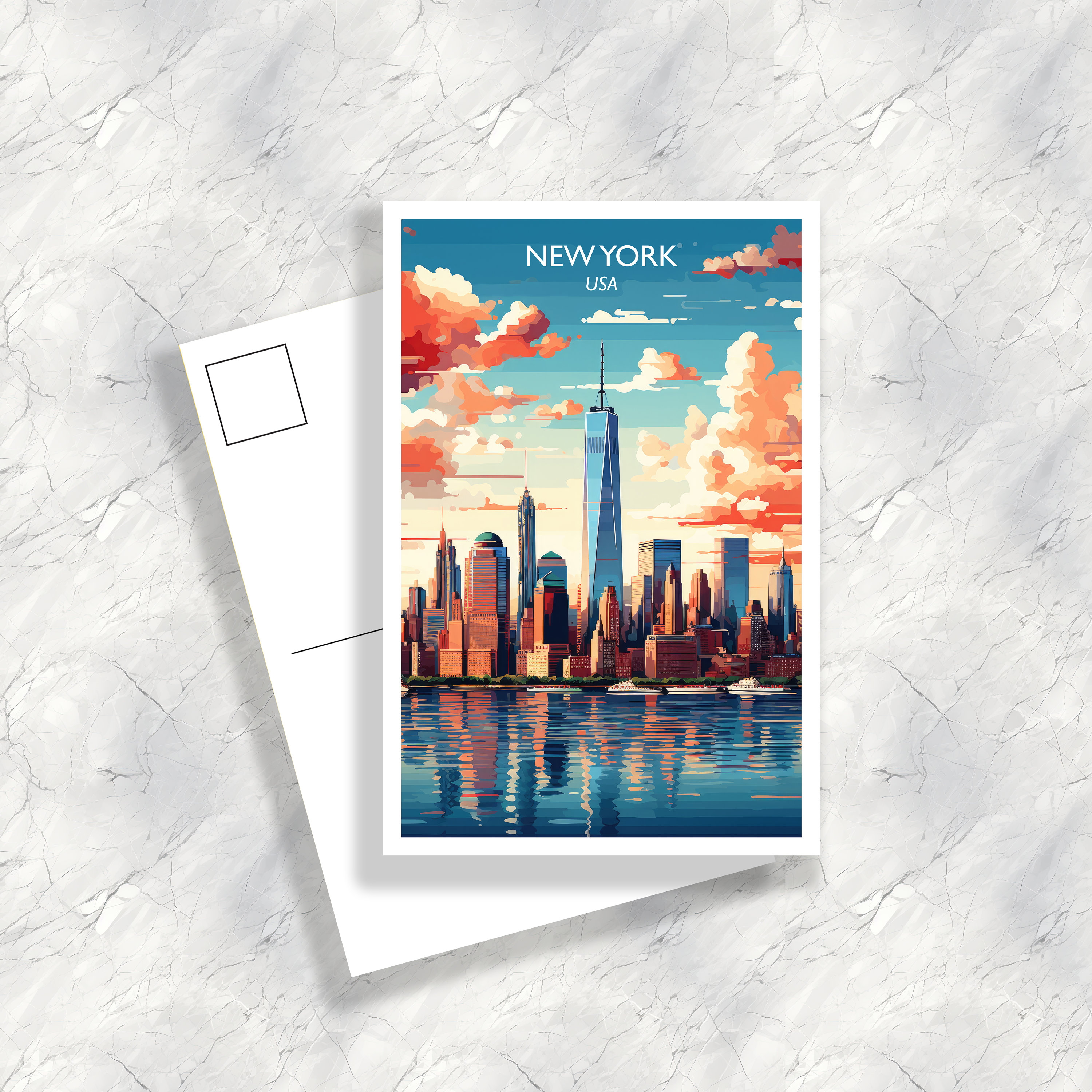 New York Travel Postcard, Manhattan Skyline, New York Postcard Art,...