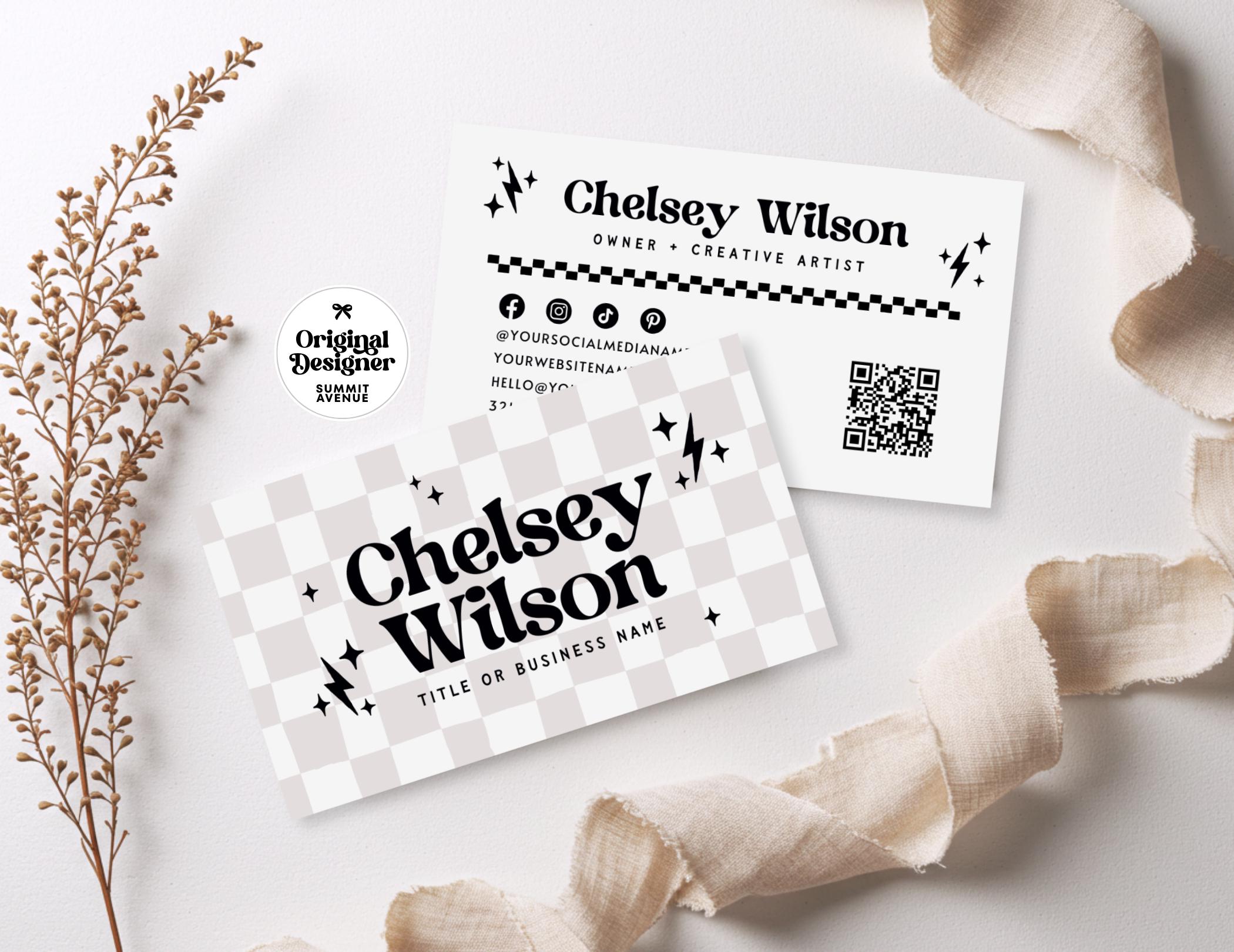 Retro Checker Business Card Template Canva, Lightning Bolt QR busin...