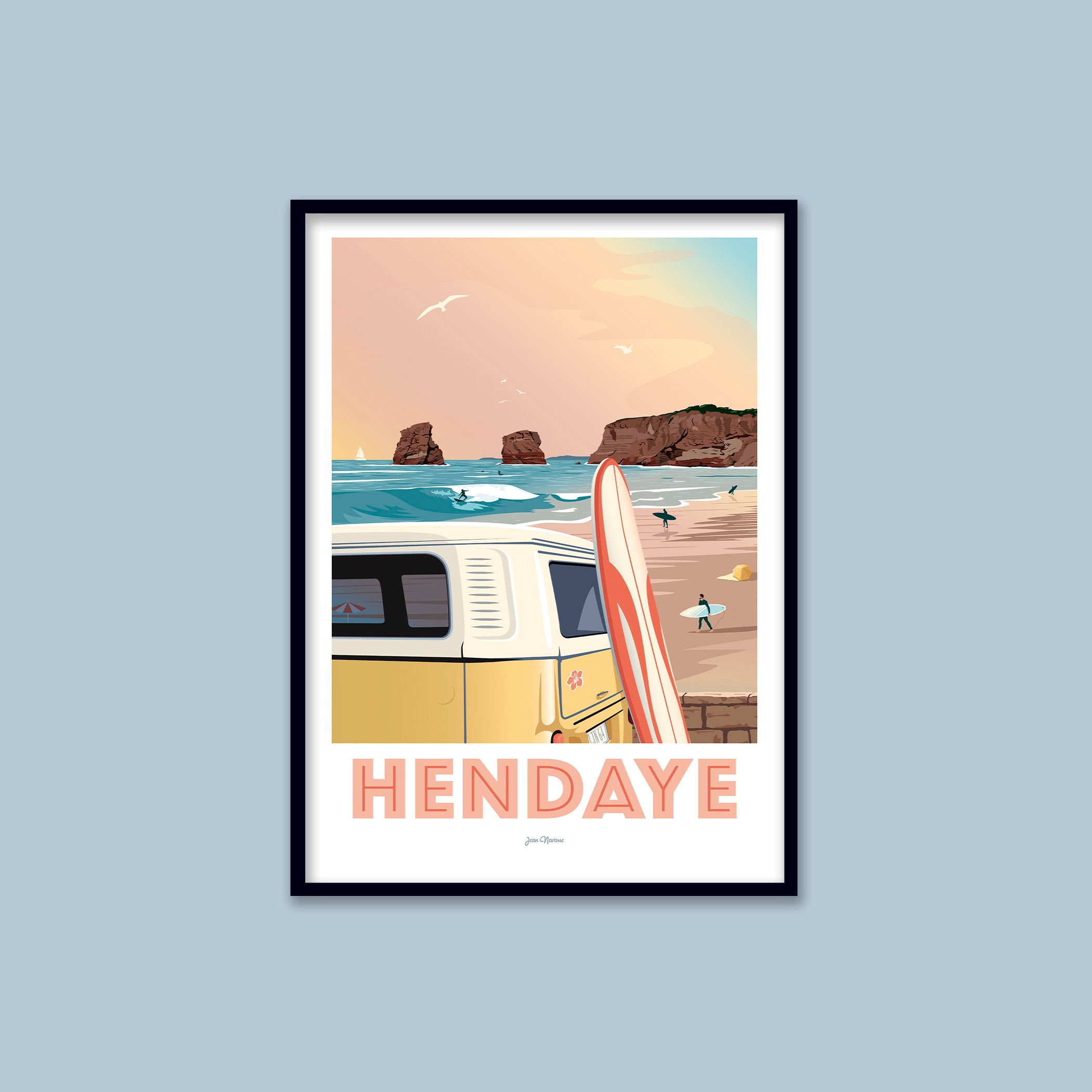 Hendaye poster / Vintage VW Combi surf poster / Wall art / Art Prin...