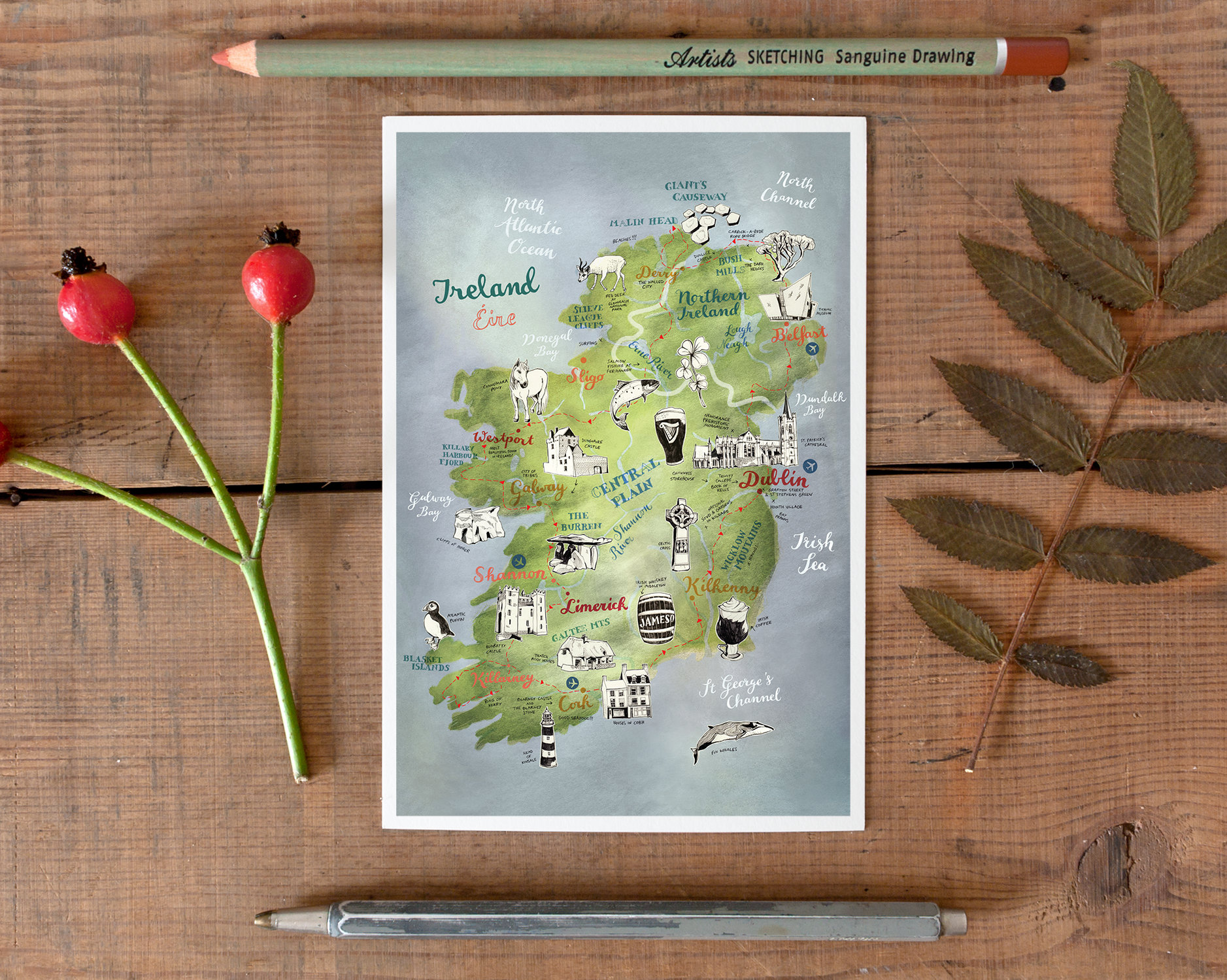 Ireland Postcard, hand drawn map, illustrated postcard, Irish art, ...
