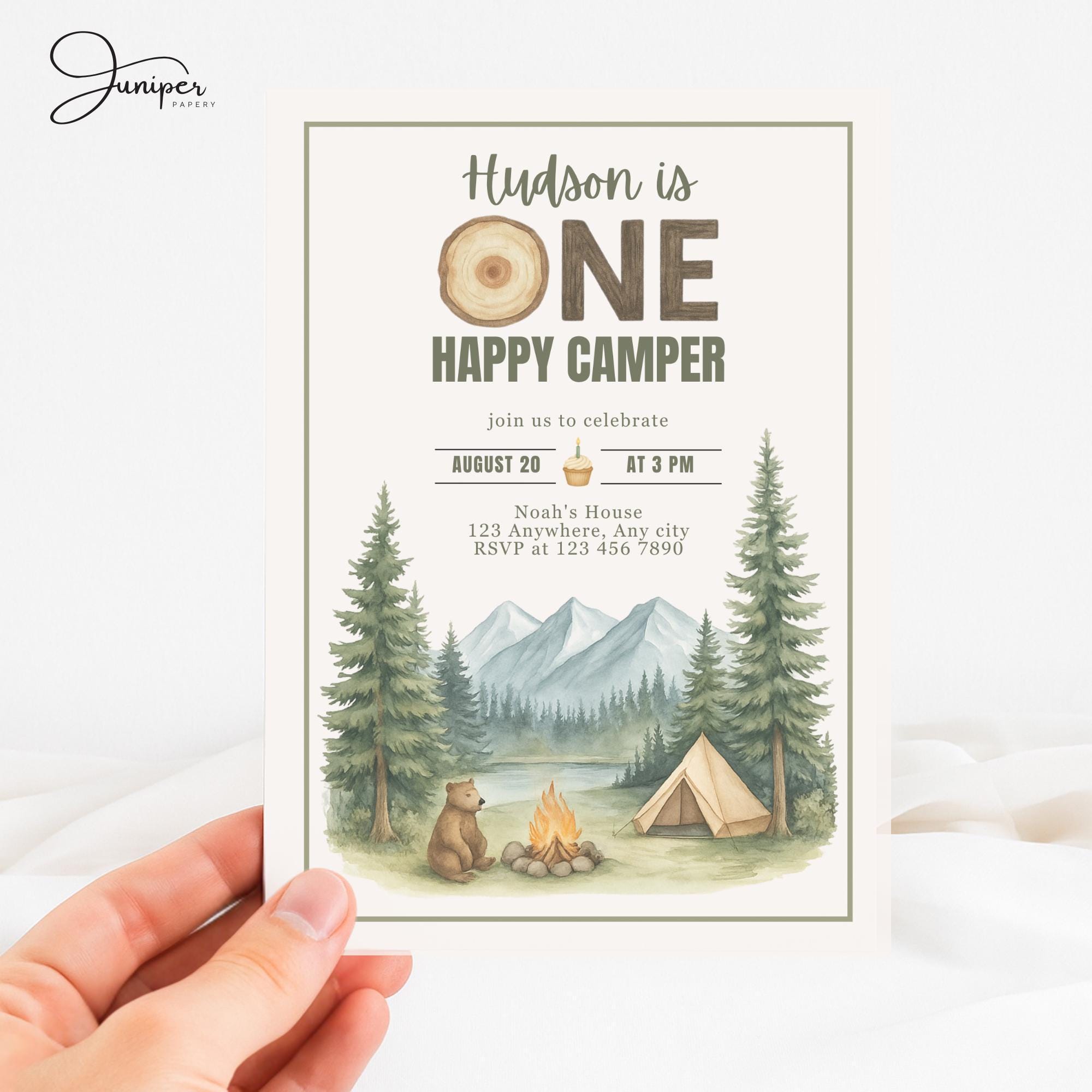 One Happy Camper Birthday Invite, Baby Birthday Invitation, Woodlan...
