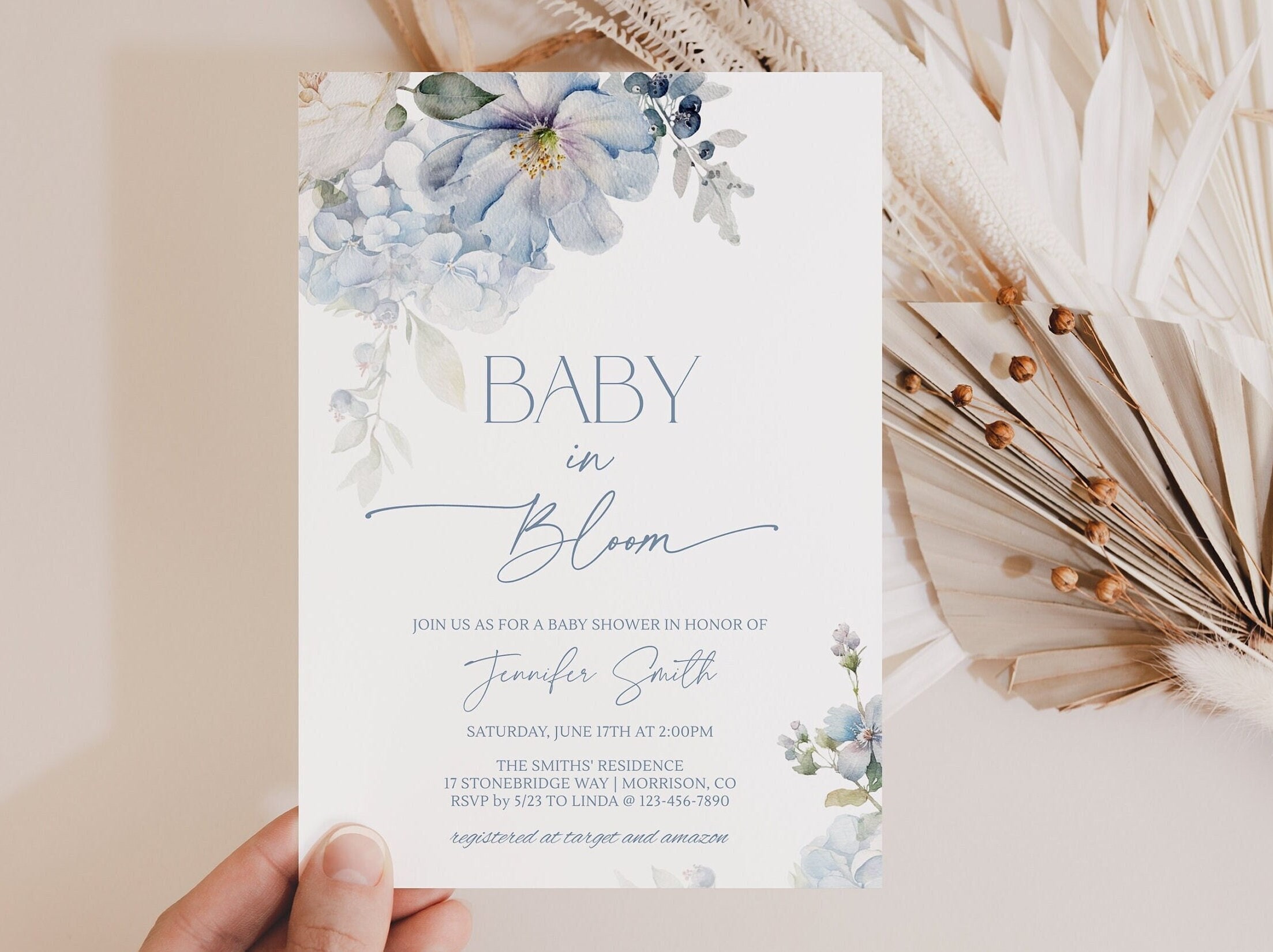 Dusty Blue Baby in Bloom Baby Shower Invitation Template for Baby S...