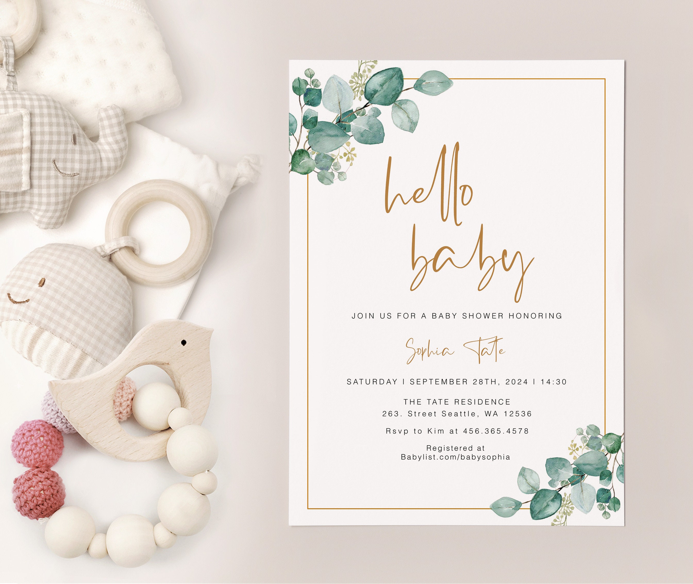 Eucalyptus Baby Shower Invite, Neutral Baby Shower Invitation, Gree...
