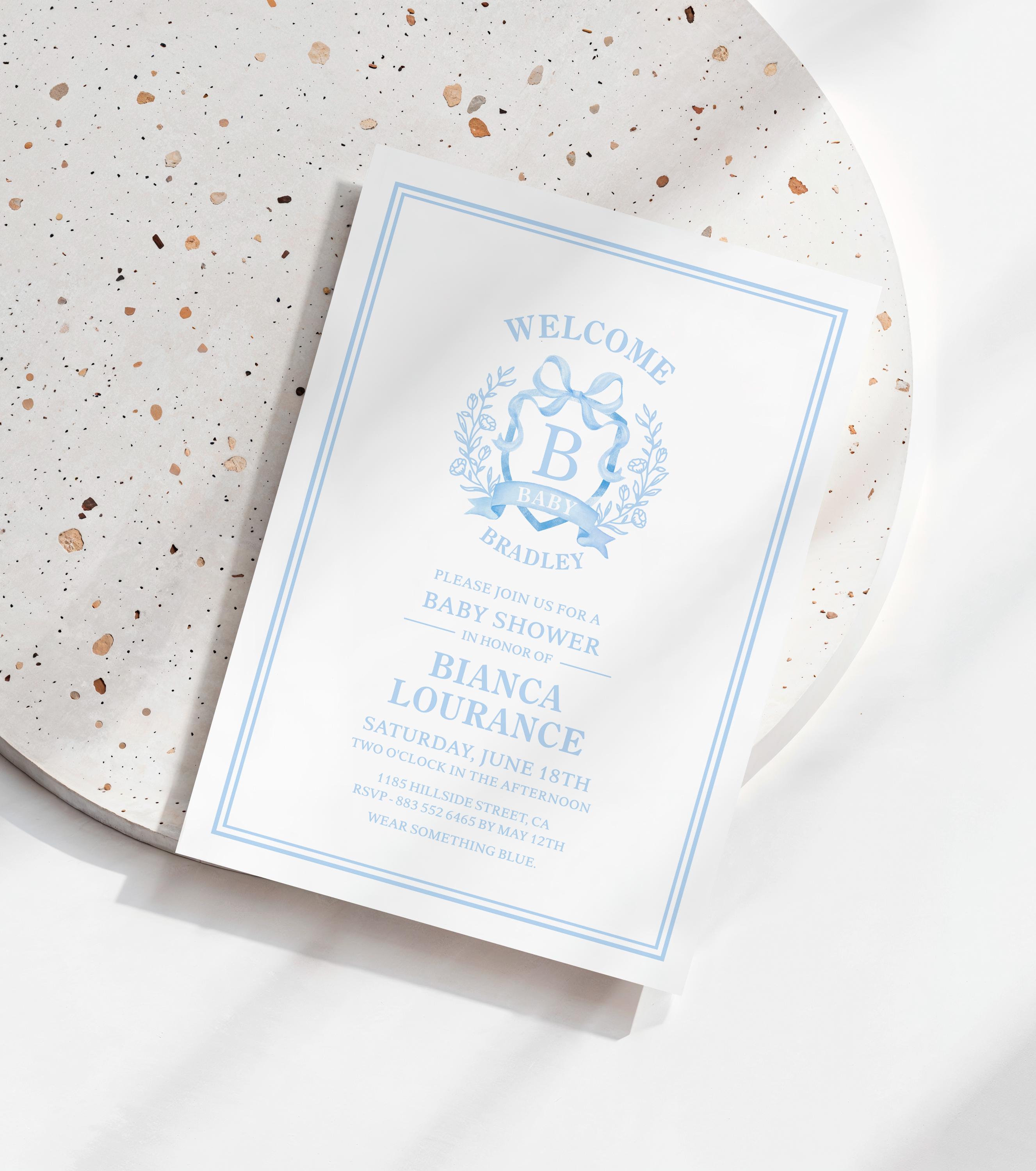 Blue monogram baby shower invite, Personalized crest baby shower in...