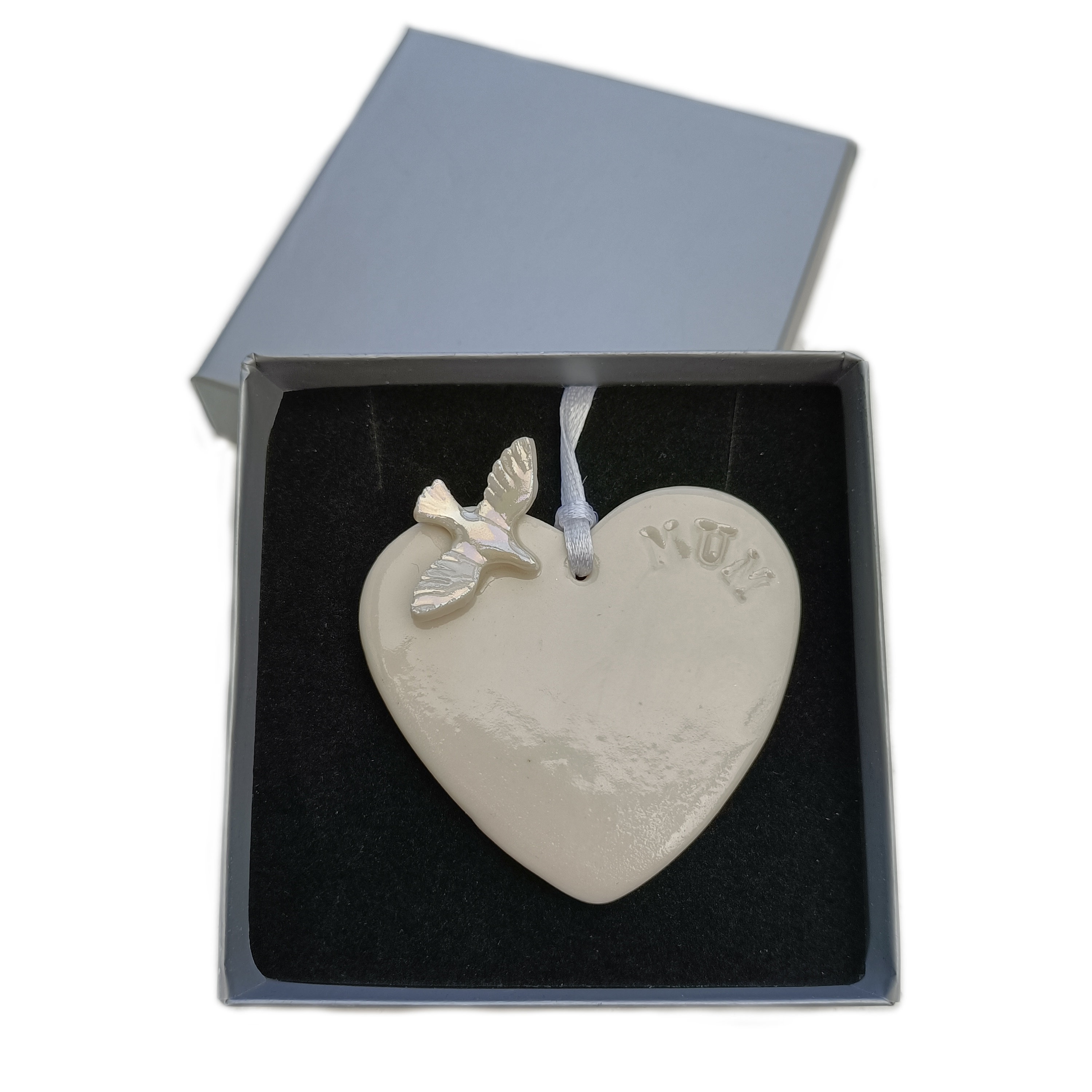 A handmade hanging heart decoration with pearl dove bird, this makes a lovely personalised memorial ...