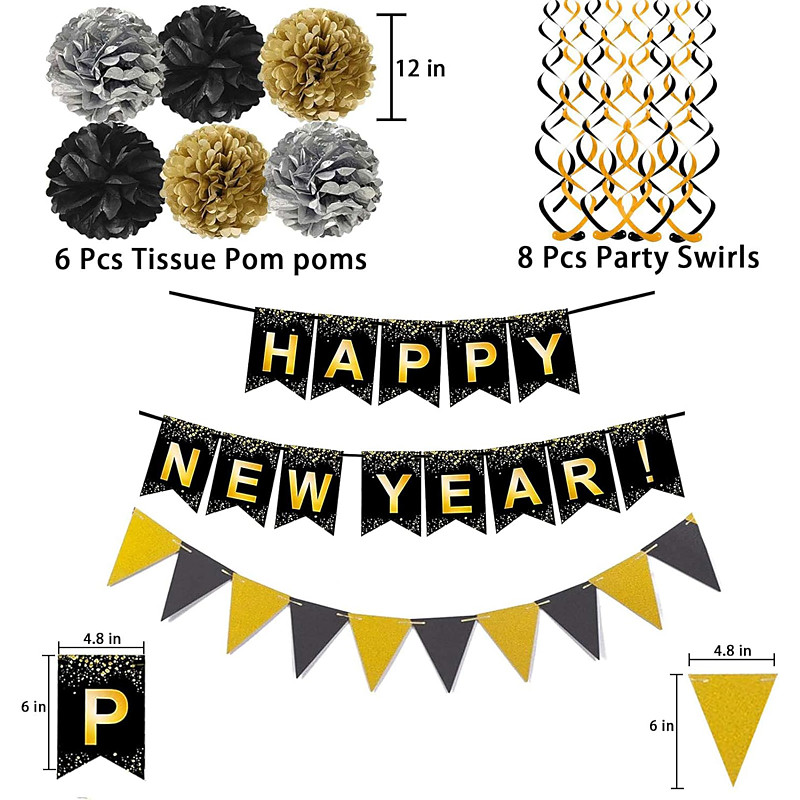 • New Years Eve Party Black and Gold Decorations Happy New Year Banne...