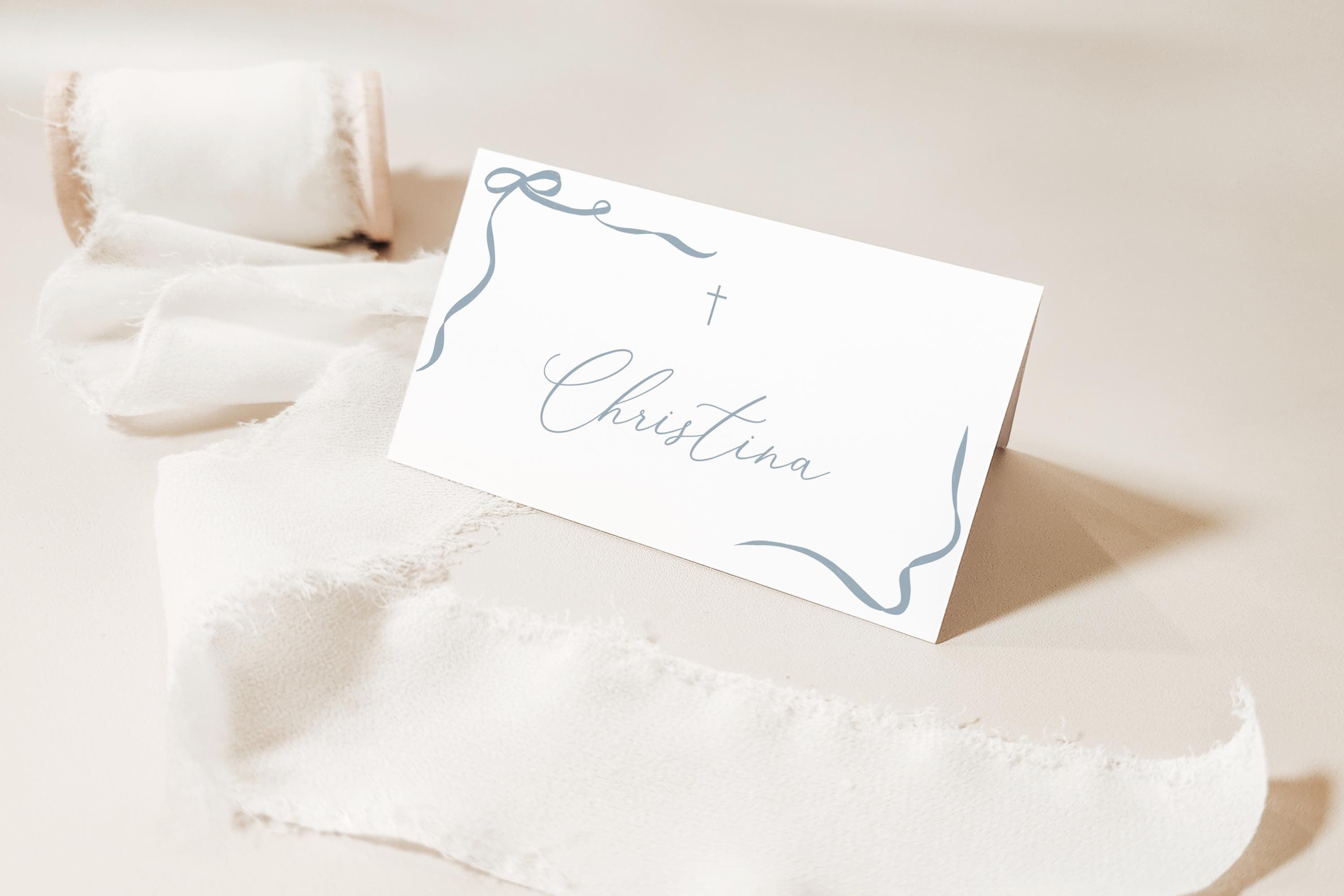 "Place Cards Template, blue girl bow baptism Place Cards, Editable Place Cards Name, Baptism Pl...